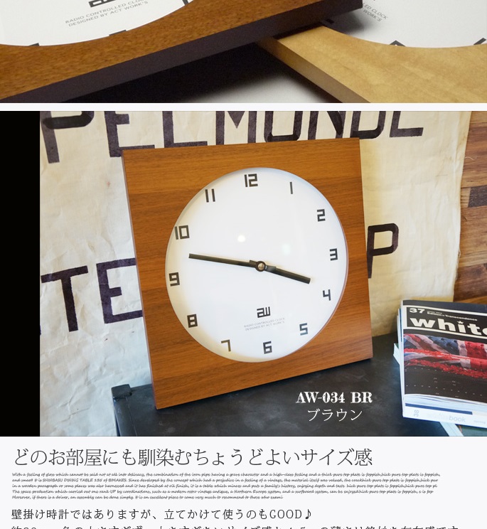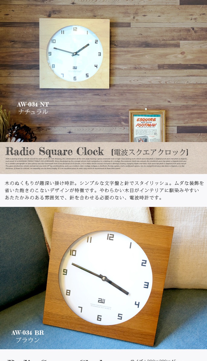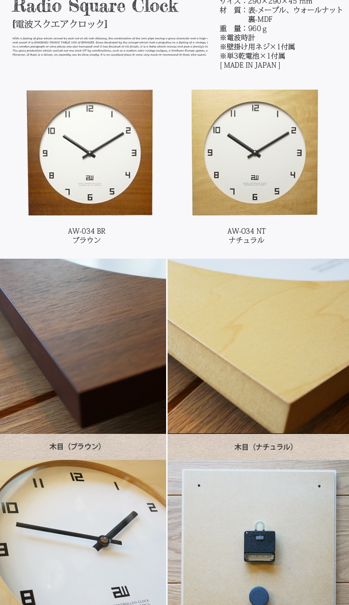 フォルム・フォント・針全てのパーツにスクエアの要素を盛り込んだデザインが特徴。直線的で端正なデザインと天然木の素材感が相まって北欧モダンを想わせる凛とした佇まいです。飽きのこないアノニマスデザインクロックです。ナチュラル・モダンスタイルにも好相性です。