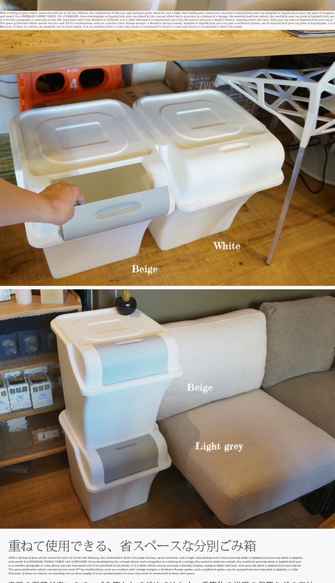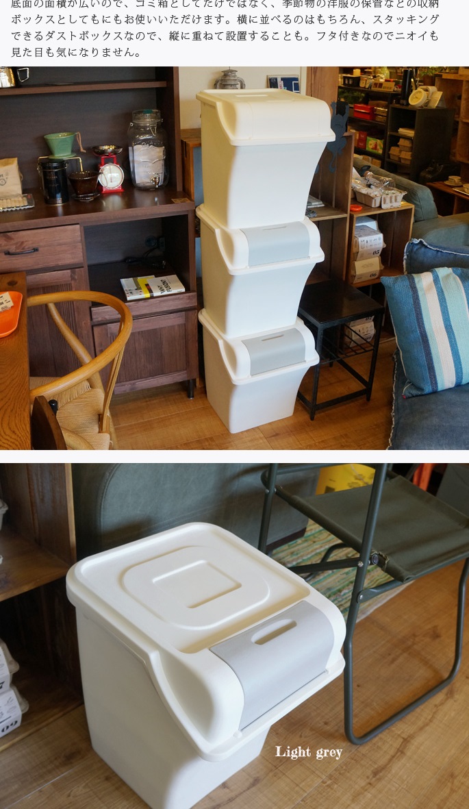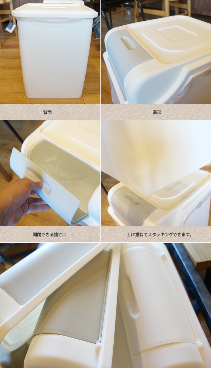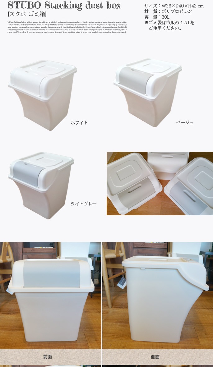 スタボスタッキングダストボックスは、限られたスペースのためにデザインされた分別用のゴミ箱です。市販の45Lサイズのゴミ袋をかけて丁度いい容量30Lのゴミ箱です。フタの開閉も邪魔にならないデザインで、サッとゴミを捨てられます。片手で開け閉めできる開口部も大きめで、2Lのペットボトルをポイッとできちゃいます。容量・機能ともに丁度良いゴミ箱です。
