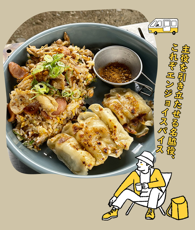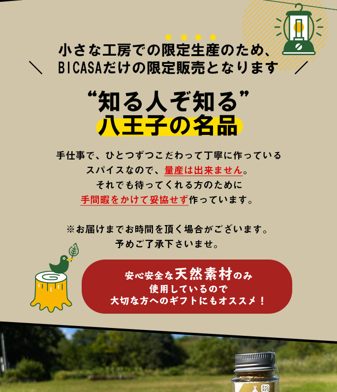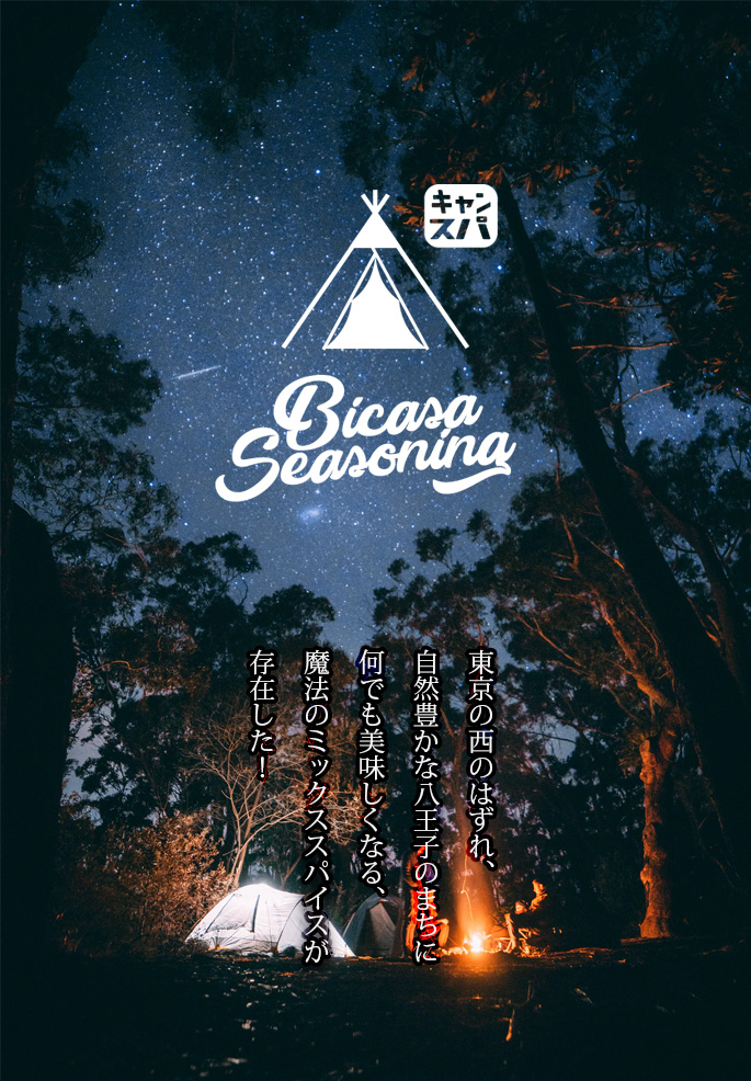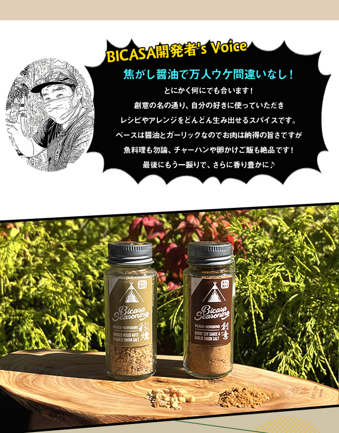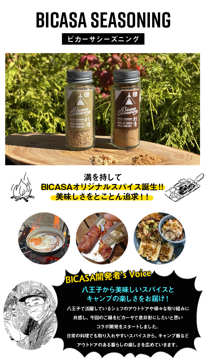 地元八王子で人気の燻製店 KEMURINO さんとコラボしました。改良を重ね出来上がったBICASA Seasoning 創意は、香ばしいこがし醤油がポイント!ひとふりするだけで本格的な味を楽しむことができるスパイスです。クセが強くないので、お肉や魚などどんなお料理にも合わせやすく、普段使いにもピッタリです。料理人、キャンパーとして使い勝手を重視して開発されているので、キャンプで気軽に本格的な味わいを楽しめるのはもちろん、下味から味つけ、味変まで、料理やお好みに合わせて使い分けができるスパイスになっています。