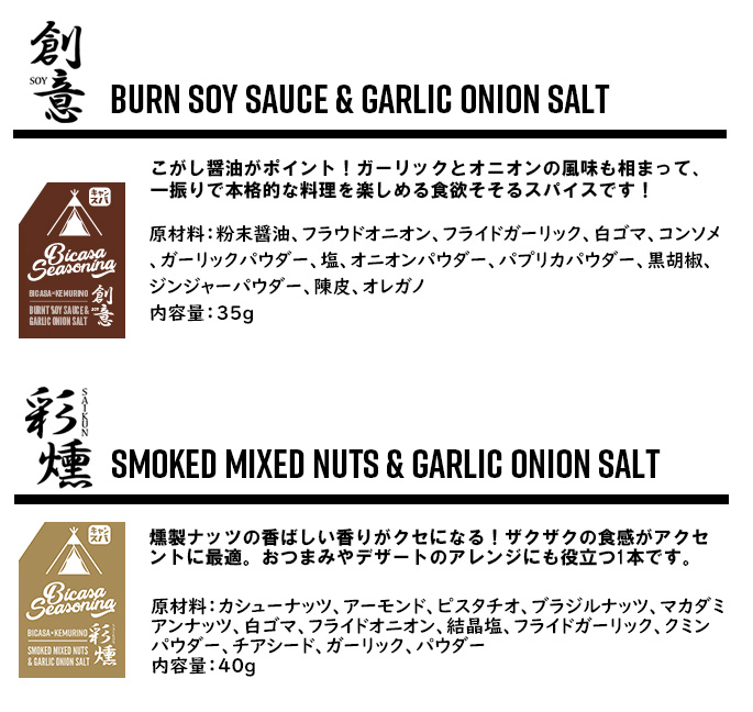 | 製品名 | ビカーサシーズニング 創意 焦がし醤油&ガーリックオニオンソルト キャンパーズスパイス |