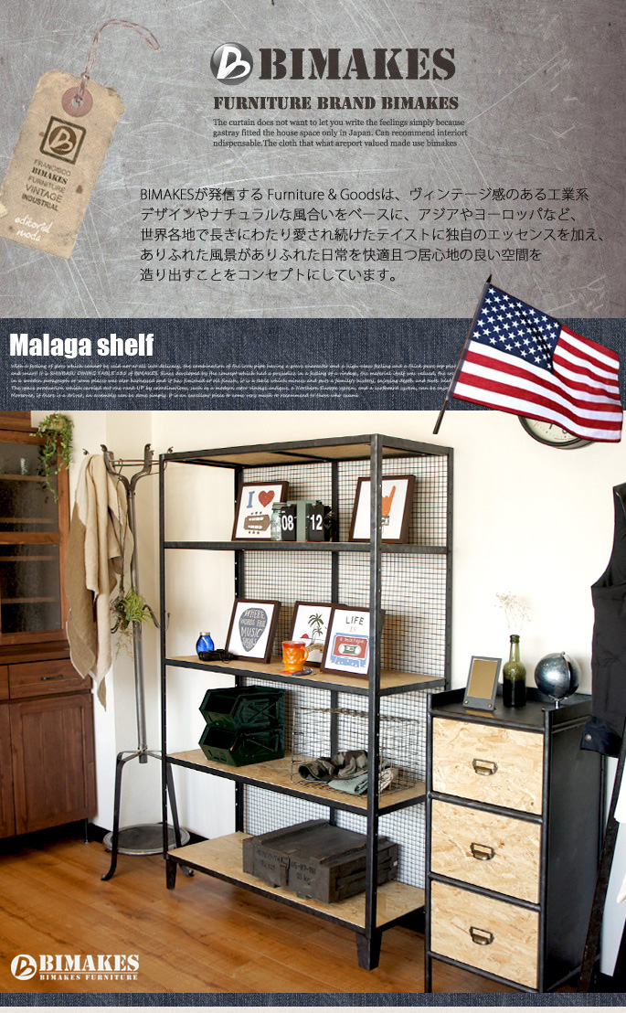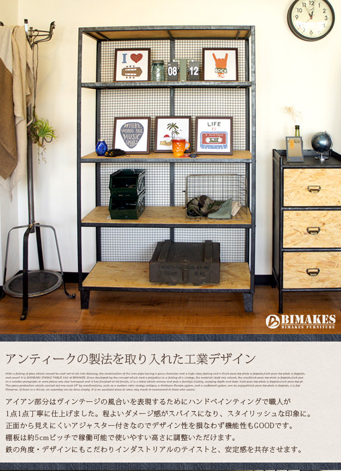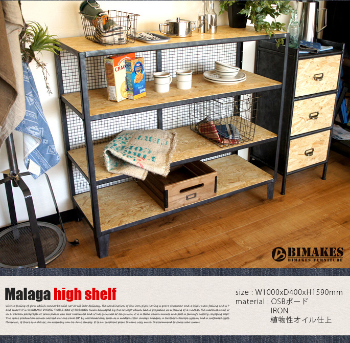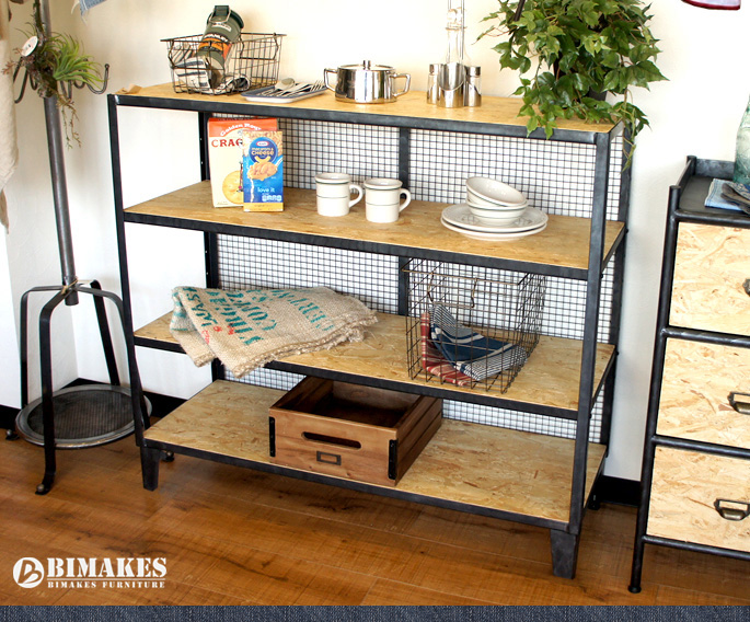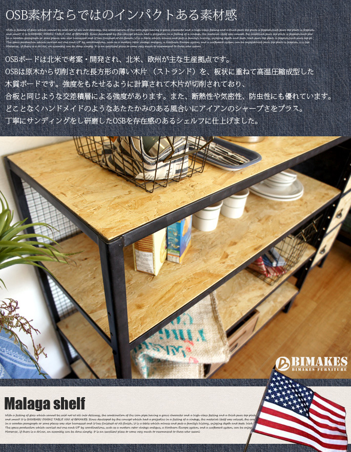 IRONメッシュを背面にあしらい、アメリカ北東部で産出され床材やウォールパネルとして親しまれているオリエンテッド・ストランド・ボード(OSB)と無骨感あるIRON(鉄)をミックスした斬新デザイン!BIMAKES(ビメイクス)のMalaga wide shelf(マラガワイドシェルフ)です。ベースフレームには重厚感とビンテージ感をそそるハンドペインティングを施したIRONを採用し、特別な工程で丁寧にサンディング(研磨)された厚みあるOSBパネルを使ったプロダクトです。棚板自体はお好みで高さ調整が可能で脚部にはアジャスターも付いていますので安心してご利用いただけます。