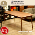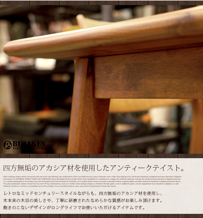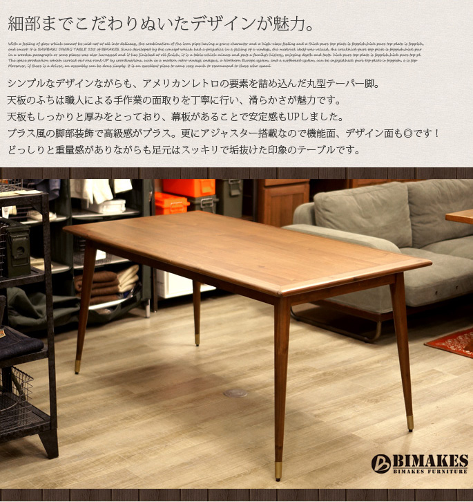 シャープなデザインでミッドセンチュリーな雰囲気を醸し出すビメイクス(BIMAKES)のダイニングテーブルです。脚部はテーパー型のスタイリッシュなデザインとなっており、脚底にはブラスを思わせるアクセントパーツが付いたデザインとなっています。天板や脚部のフォルムには、木本来のぬくもりを感じるように無垢材を削りひとつひとつ丁寧にサンディングを施し、木肌を感じる滑らかでやわらかなアールをとったフォルムになっています。サイズはW:1600×D:800×H:720で、ゆったりと使える4人掛けテーブルで天板の四方は無垢材を使用したこだわりの設計となっています。