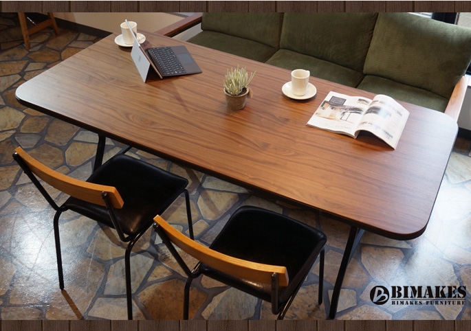 ミッドセンチュリーデザインを思わせる曲線と直線をミックスさせたデザインが際立つビメイクス(BIMAKES)のダイニングテーブルです。1940年代アメリカのワークテーブルをモチーフにしたすっきりとした脚部にフラットで開放感あるテーブルトップにハンドプレスで捲きつけたIRONがカッコいいプロダクトです。テーブルトップの素材には渋みと深みがある色合いで高級感が滲むウォールナットを採用し、シャープなスタイルの中にもWOOD本来のぬくもりも感じさせてくれます。サイズはW:1800×D:800×H:720mmのゆったりめのサイズとなっています。