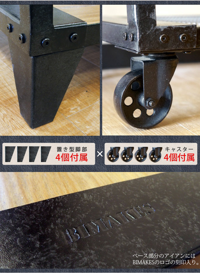 職人の手により一つひとつ丁寧にハンドペインティングされたビンテージ塗装と深みと渋さのあるナチュラルな無垢板のベースがカッコいいBIMAKES(ビメイクス)のBURREL IRON HANGER STAND (バレルアイアンハンガースタンド)です。節や木目の濃淡がある木部を使用したベースにトローリー風の車輪とイギリスアンティークのハンガースタンドが融合したデザインはスタイリッシュで実用性も兼ね備えたハンガースタンドとしてご利用いただけます。本体ベースの表と裏にはフックを掛けられる16個の穴が開いており、付属のフック(8個入り)をお好みの場所に設置しお使いいただけるプロダクトとなっています。置き型脚部と車輪脚部が其々4個ずつ付属しています。お好みのスタイルに合わせてセットができます。
