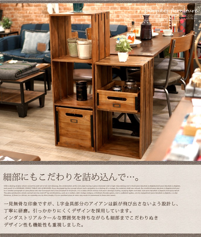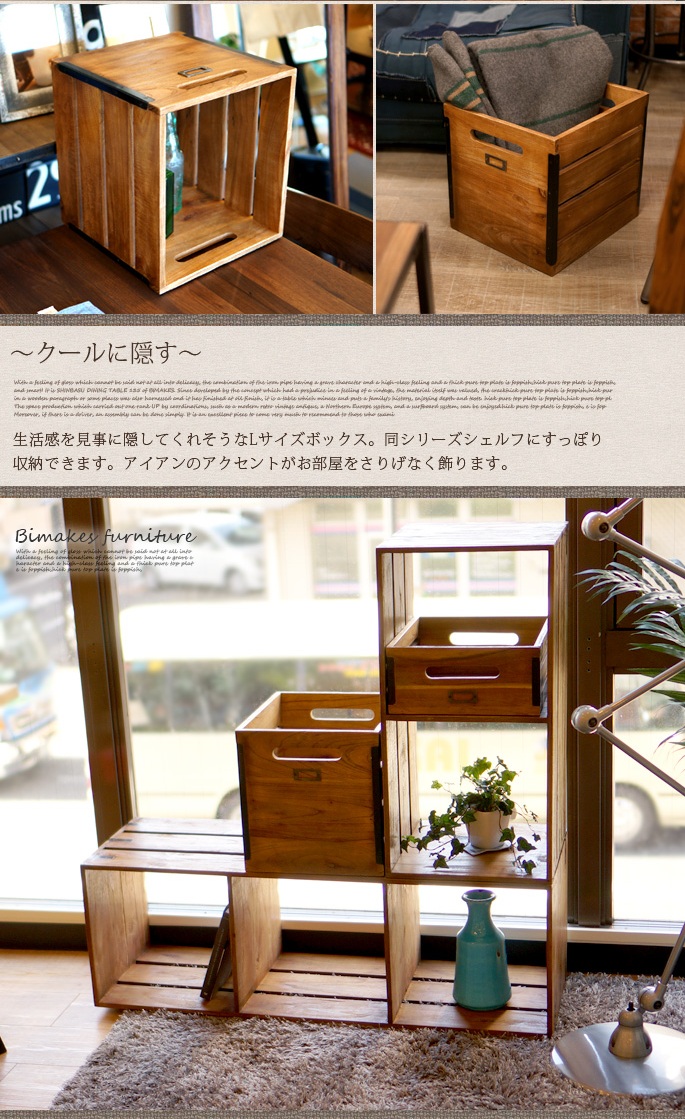 古材チーク無垢に何度もオイルを塗り込み深みのある特徴的なオールドチークの風合いが印象的なBIMAKES(ビメイクス)【OLD TEAK BOX (M)(オールドチークボックス M 】です。前後に持ち易い取っ手付きのマルチ収納BOXとなっており、エッジの部分には無骨でインダストリアルな雰囲気を際立たせるIRON(鉄)プレートとスクリュー(ネジの頭)をデザインとして採用しています。サイズは、310x345x140mmのMサイズとひと回り大きい310x345x320mmのLサイズをご用意しております。一般的なCDやDVDケースや本・雑誌、タオルや衣服等・・・用途は様々にご利用いただけます。ビンテージウッドを使用した「木」本来の表情や個体差、経年変化を楽しめるプロダクトとなっています。同シリーズのオープンシェルフと合わせてご利用いただければ使い方の幅も広がります。
