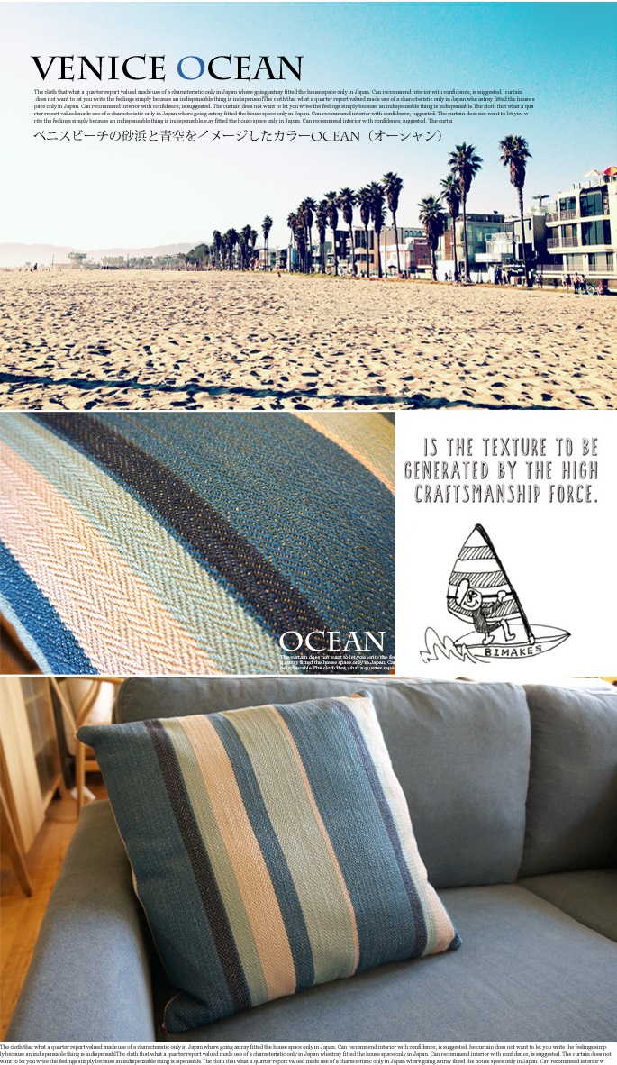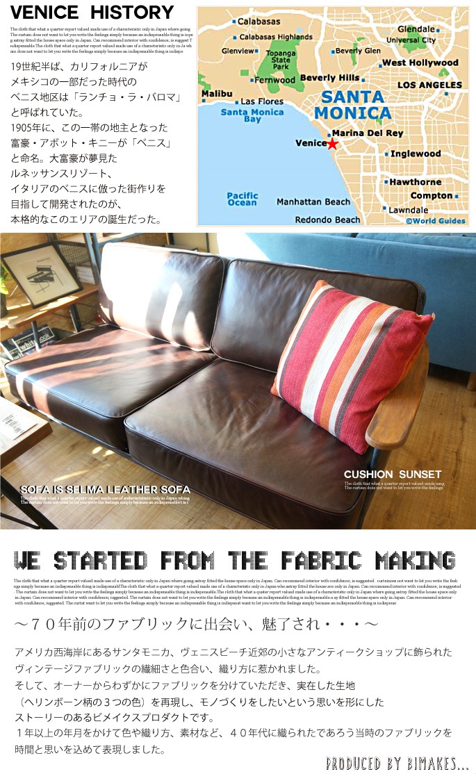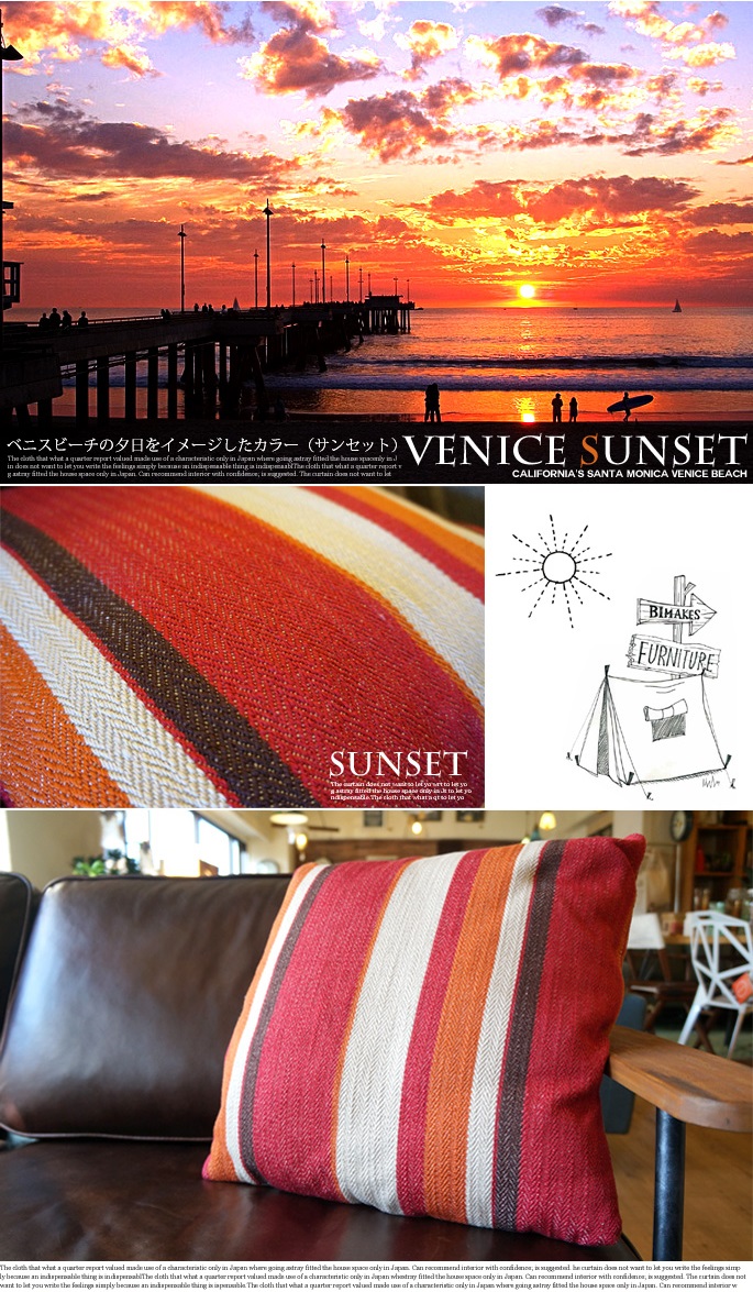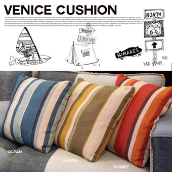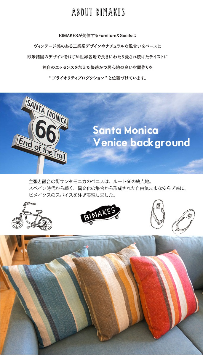 アメリカ西海岸にあるサンタモニカ、ヴェニスビーチ近郊の小さなアンティークショップに飾られたヴィンテージファブリックをモチーフに織り方の繊細さと色合いを再現したヘリンボーン柄がオシャレ♪BIMAKES(ビメイクス)のVENICE CUSHION(ベニスクッション) です。40年代頃に織られていただろう当時のファブリックを可能な限りリメイクした逸品です。古くから伝統的な織り方と称されるヘリボーン柄を選び抜かれた滑らかなコットン生地で仕上げ、ウレタンフィル(中綿)を豊富に詰め込んだふんわりと気持ちいの良い45cm角のスクエアクッションです。