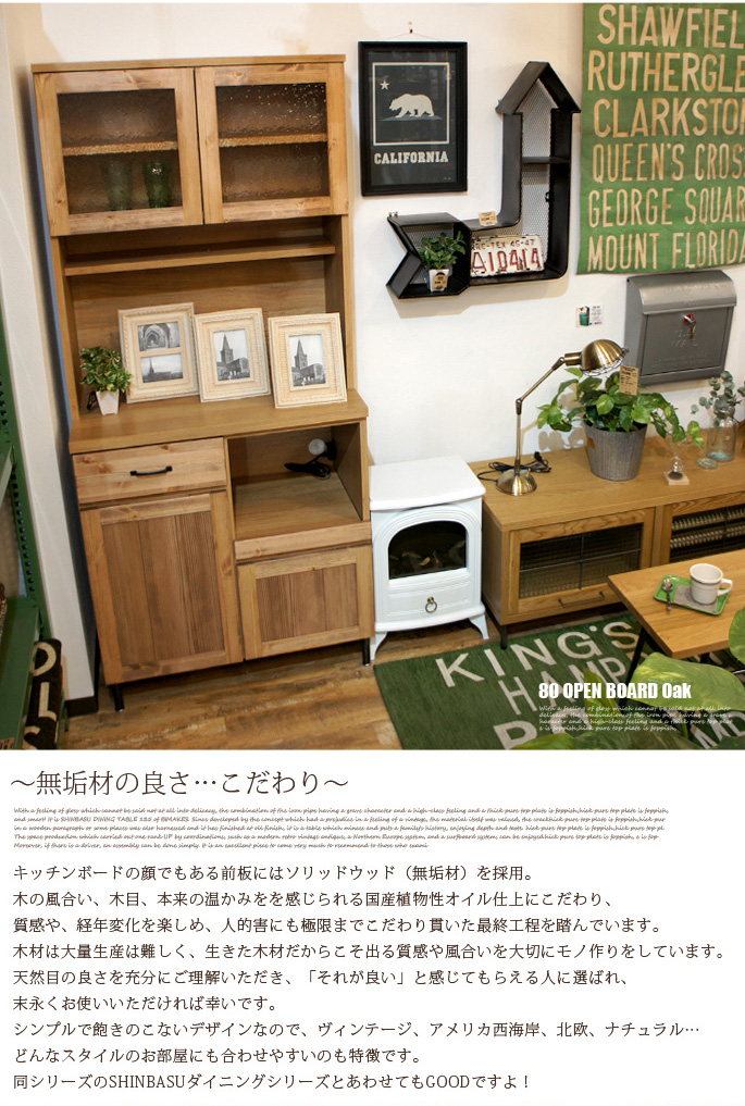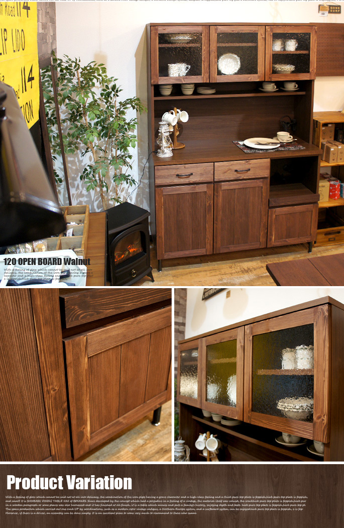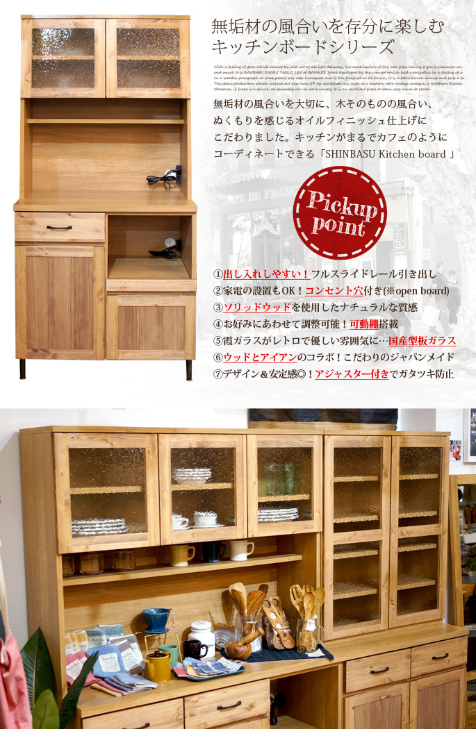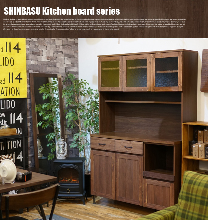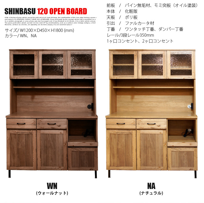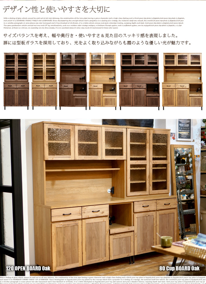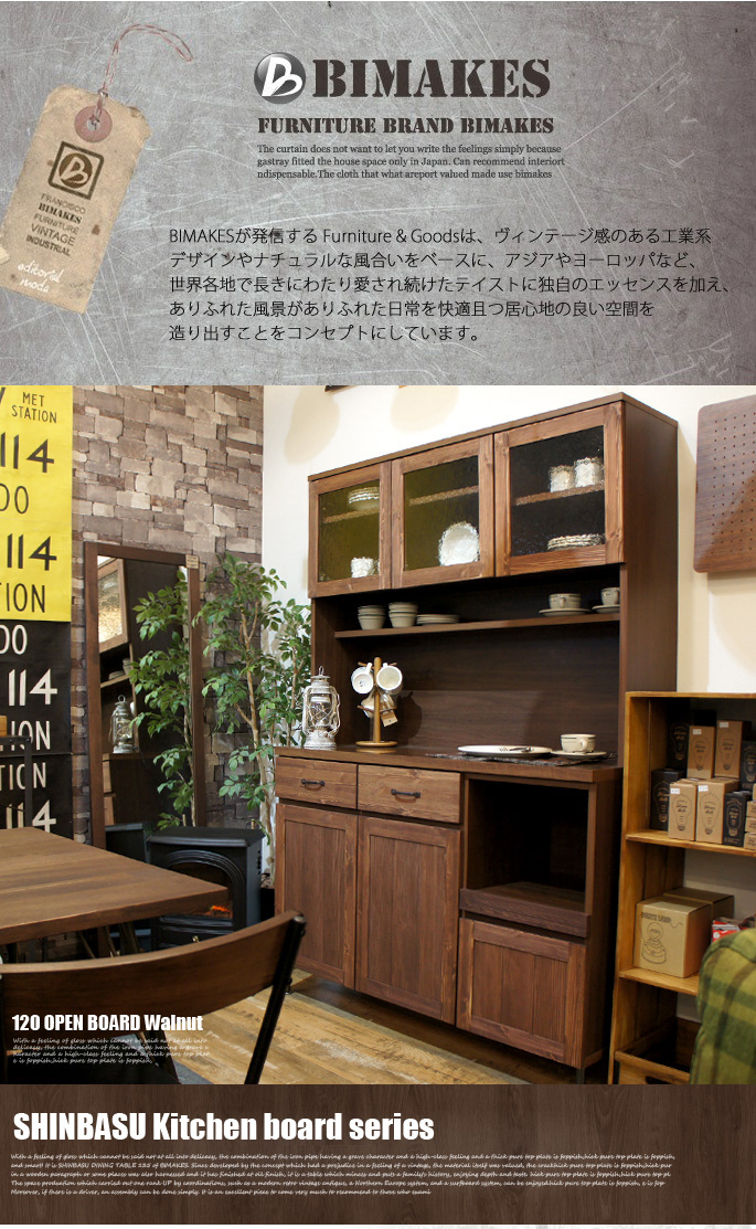 味わい深い天然木のヌクモリを感じるSHINBASUシリーズに豊富な収納を兼ね備えたダイニングボードが登場!BIMAKES(ビメイクス)のSHINBASU OPEN BOAD 120(シンバスオープンボード120)です。同シリーズならではのオイルフィニッシュ仕上げにこだわり、天然木ならではのナチュラルな質感と使い易さにこだわった逸品です。上台のオープンスペースには電子レンジや炊飯器、ポット等が設置できる空間があり、下台には頑丈で滑らかに引き出し易い引出が付き、上台・下台ともに食器が入れやすい構造で収納力があるダイニングボードとなっています。またガラスには現在では生産が難しくなった昔ながらの製法にこだわった、サハラクリア仕様となっています。カラーはナチュラルとダークブラウンの2色展開です。