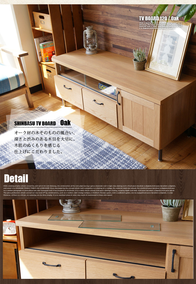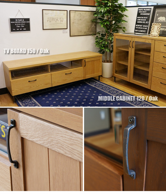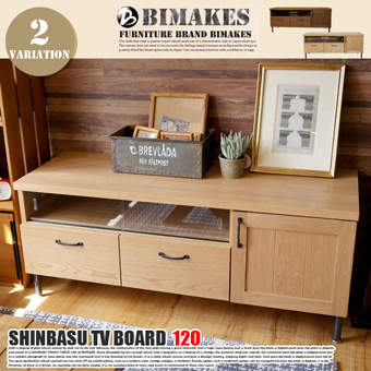 素材そのものの風合いと天然木のヌクモリを感じるオイルフィニッシュ仕上げにこだわったBIMAKES(ビメイクス)のSHINBASU TV BOARD120(シンバスTVボード120)です。其々オーク材とウォールナット材を使用し、脚部には安定感と耐久度があるブラックスキンアイアンにヴィンテージ感と高級感を漂わせるクリア塗装を施した仕様となっています。天然木ならではの風合いは使うごとに深みを増し、飽きずに長くご愛用いただけます。サイズはW1200×D440×H495mmとなっており、脚底にはアジャスターが付いておりますので微妙な高さ調整も可能となっています。レトロ、ヴィンテージ、西海岸等、幅広いルームシーンでご利用いただけるアイテムです。