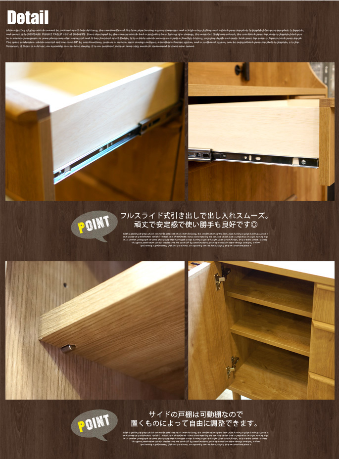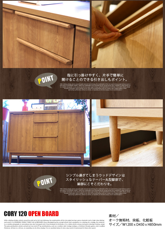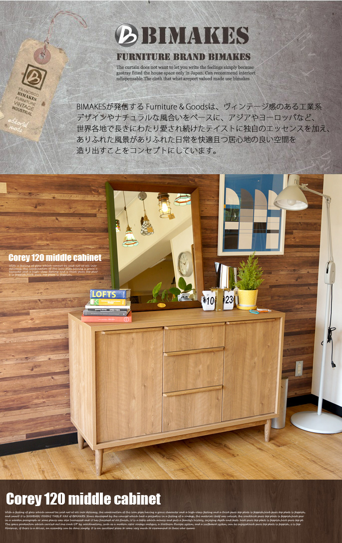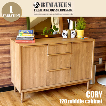 昔ながらの旧き良きデザインであるアンティークフォルムの優しいアウトラインと渋みと深みのある色調が高級感を感じさせるBIMAKES(ビメイクス)のCORY MIDDLE CABINET120(コーリーミドルキャビネット120)です。TOPの天板はフラットで、フォトフレームやコンポ、本や雑誌、観葉植物などが置ける十分なスペースをとりシンプルに仕上げ、可動棚となっている2つの扉とスライドレールで出し入れし易い収納力をもった引出を搭載したリビングボード(サイドボード)となっています。脚部にはオークの無垢材を丁寧に削り出し、やわらかい丸みのあるテーパー(先細り)デザインでスタイリッシュに仕上げています。