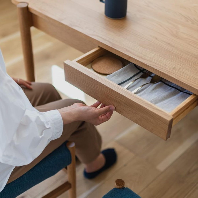 丸みを帯びた天板に脚を押し付けることでくぼみが生まれたような形状のテーブルです。収納に便利な引出し付きです。