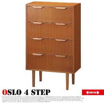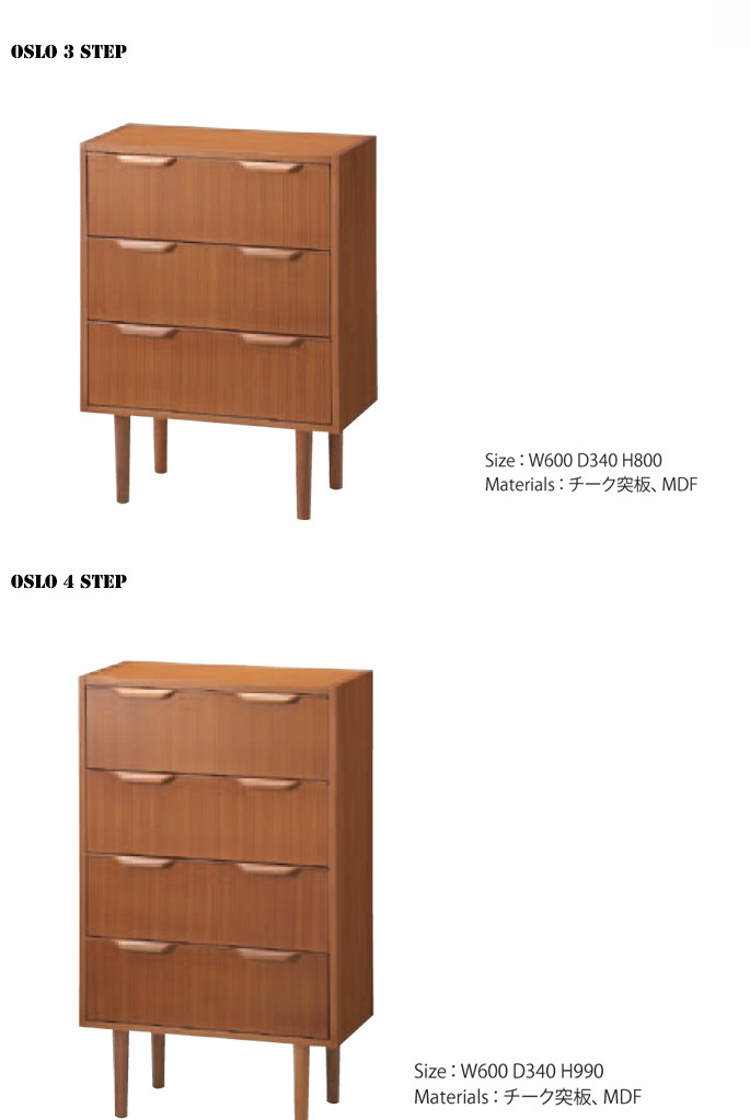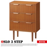 Oslo 4 step(オスロ4ステップ)は、北欧家具を想わせるシンプルでレトロなデザインの3段チェストです。奥行が34cmとコンパクトにつくられていますので、一人暮らしのお部屋やあまりスペースのない場所でも圧迫感なくご使用いただけます。シンプルなデザインは北欧テイストをはじめとした様々なテイストのインテリアに合わせやすく、コーディネートをお楽しみいただけます。チーク突板を使用した美しい木目が印象的で、脚部デザインが、軽やかな印象を演出致します。