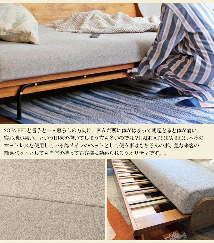 HABITAT SOFA BED/ハビタソファベットは、一人でも簡単に座面を伸び縮みさせるが可能です。従来のSOFA BEDに比べると重量も軽く出来ている為、移動も楽々です。座面クッションは ライトウェーブのシングルサイズをそのまま採用していて 通常のウレタンの中材と比べて通気性が良い為 蒸れない 乾きやすい と言うメリットがあります。座面の手前(端)は 型崩れしないようにセンターと比べるとライトウェーブの密度が濃くなっています。普段使いは座面を伸ばした状態で「座敷」のような感覚で足を伸ばしてゴロゴロ過ごしたり、子供と一緒に本を読んだり、カードゲームをして遊んだりできます。急な来客時には座面を縮めて普通のSOFAとして使用したりと、様々な場面に万能に対応する事が出来ます。