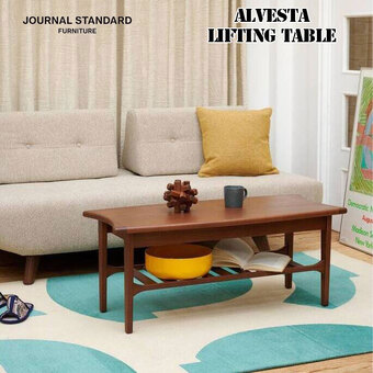 JOURNAL STANDARD FURNITUREオリジナル、ALVESTAシリーズのコーヒーテーブルです。シンプルな木工仕様の機構を採用し、天板の高さが41cmから59cmに上がるリフティングテーブル。