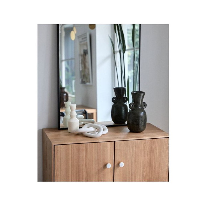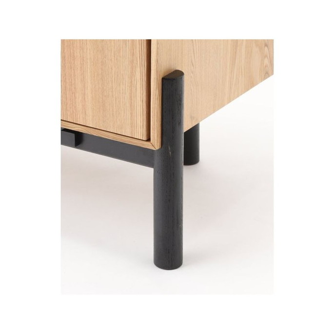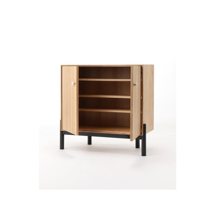 黒い脚と、真鍮と大理石のつまみがアクセントのサーバー。後ろ側の脚が内側に入っている構造で、様々な角度から見たときにデザインを感じていただけます。また、脚を構成するホゾ組みをあえて見せるようにし、職人の拘りが垣間見えるような技術を散りばめています。扉周りを欠き込むことにより、フレームが軽く見え、軽快に感じていただけます。
