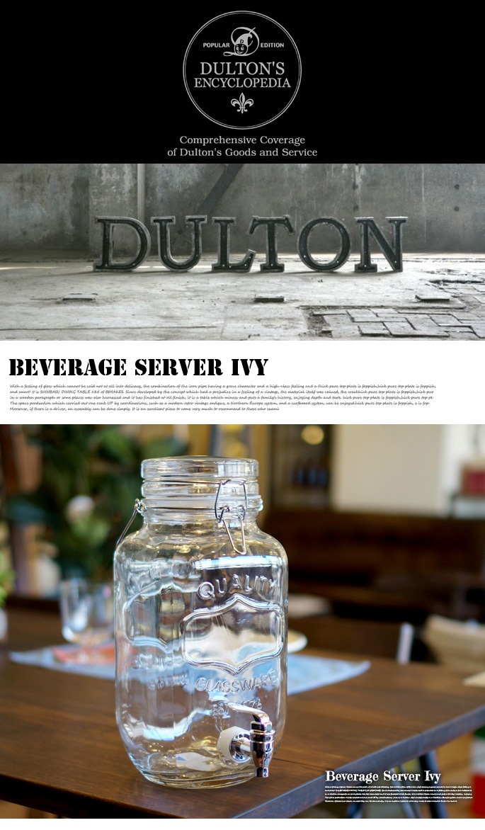 DULTONのビバレッジサーバーシリーズは、保存ビンに小さな蛇口がついた便利でおしゃれなディスペンサー式ガラス容器です。自家製サングリアや季節のフルーツでシロップを作ったり、果実酒を作ったり、ホームパーティーや食卓でも大活躍です。飲食店でのレモンウォーターやハーブウォーターのセルフサーバーとしてご使用いただいても素敵です。食洗機のご使用は不可となります。製造工程上、ガラス表面に気泡や歪みが生じる事がございますが、製品特性としてご理解下さい。