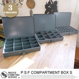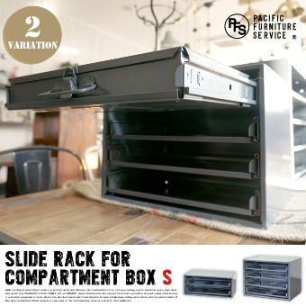 SLIDE RACK FOR COMPARTMENT BOX S(スライドラックフォーコンパートメントボックスS)は、COMPARTMENT BOXを入れて引き出しとして使用する事ができるラックです。アメリカのガレージや工場等で使われている物で、非常に頑丈で錆にも強く作られています。引出し部分は滑車が使われており、重いものを入れてもスムーズに引出せます。また、セットしたままボックスの開閉も可能で機能的です。2段と4段の2タイプ、サイズはSとLからお選びいただけます。※中に入れるボックスは別売です。SサイズはCOMPARTMENT BOX Sサイズ専用、LサイズはCOMPARTMENT BOX Lサイズ専用となっています。ご購入の際は、ラックとCOMPARTMENT BOXのサイズのお間違えの無いようご注意下さい。