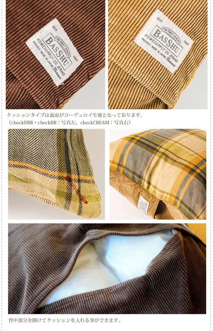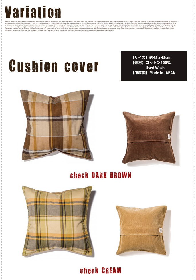 古き良き時代のフランネル生地に着想をえて、生地からオリジナルで製作されたクッションカバーです。素材は綿 100%。生地の存在感を活かし、表面はシンプルに、裏地には肉厚のコーデュロイを使用し懐かしい雰囲気に仕上げました。また、最後に洗い加工を施しており、太番手チェックならではのポコポコとした凹凸が目にもあたたかで豊かな表情を加えています。ヴィンテージ・レトロ・ナチュラル・オーガニックスタイルに。