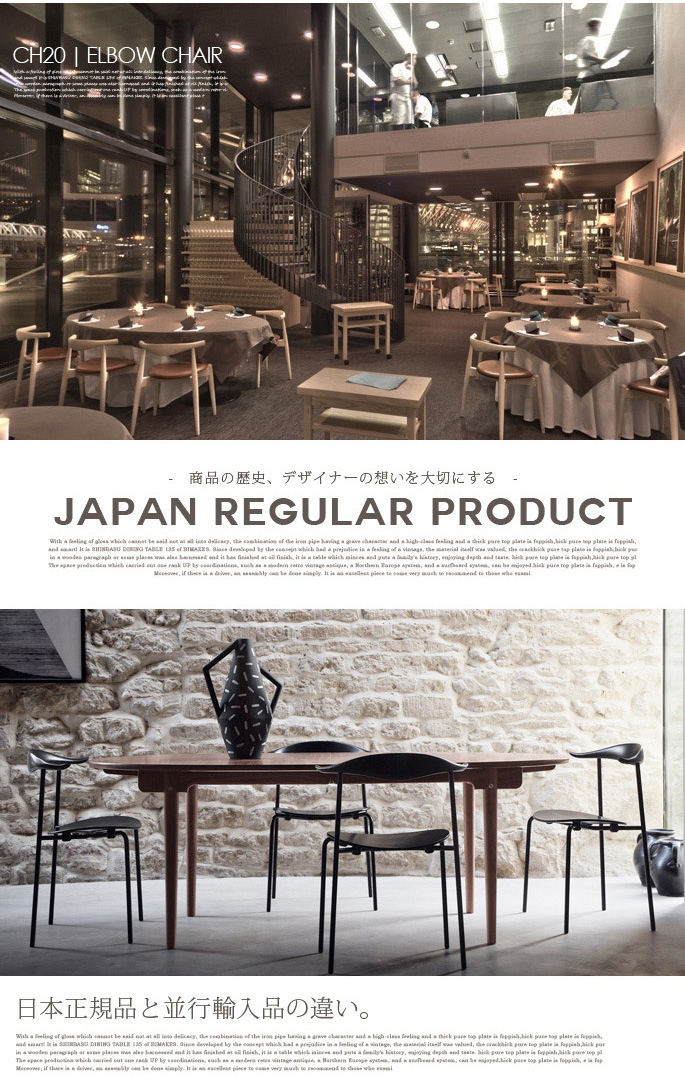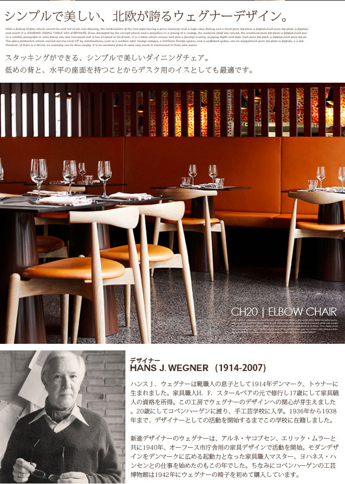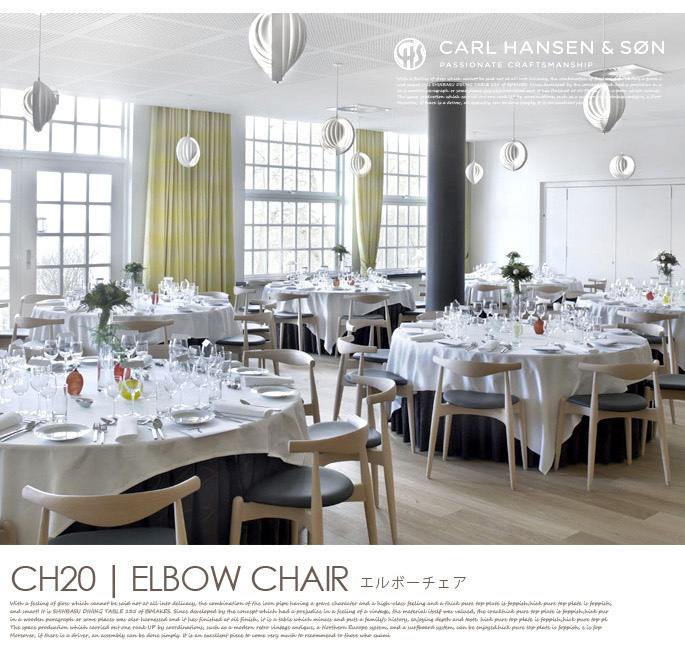CH20 ELBOW CHAIR(エルボーチェア)はHANS J WEGNER(ハンス・J・ウェグナー)によりデザインされ、CARL HANSEN & SON(カールハンセン&サン)により製造されたイスです。1956年にデザインされたものの費用、技術面から量産に結びつかなかった椅子ですが2005年に復刻され根強い人気を誇るデザインチェアです。当店で取り扱うCH20はカールハンセン&サン ジャパンとの直接取引により販売する正規品です。※こちらは国内在庫商品のページになります(納期:2~3週間)