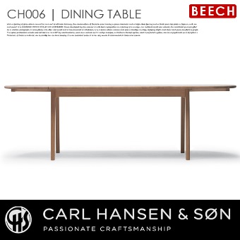 CH006 ダイニングテーブル BEECH(ビーチ)はHANS J WEGNER(ハンス・J・ウェグナー)によりデザインされ、CARL HANSEN & SON(カールハンセン&サン)により製造されたテーブルです。1982年にデザインされ無垢材ならではの風合いを活かしたエレガントなフォルムが特徴的なテーブルです。来客時など使用人数や用途に合わせて最大236cmまで伸長することが可能な使い勝手の良いデザイン家具です。当店で取り扱うCH006はカールハンセン&サン ジャパンとの直接取引により販売する正規品です。