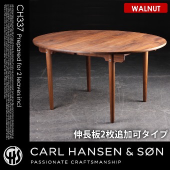 CARL HANSEN & SON(カールハンセン&サン)のハンスJ.ウェグナー(HANS J WEGNER)が1962年にデザインした【CH337 ダイニングテーブル 140×115 Walnut(ウォールナット)】です。基本サイズは140×115cmの楕円形スタイルのダイニングテーブルとなっており、115×60cmの伸長式板を最大2枚迄追加することができるプロダクトです。仕上げは、ラッカー・オイルの2種類からお選びいただけます。精巧な木工技術と優美フォルムの融合が見事なデザインテーブルです。(※伸長板をご追加の場合はシリーズリンクから別ページにてご購入下さい。)