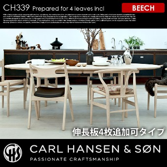 CARL HANSEN & SON(カールハンセン&サン)のハンスJ.ウェグナー(HANS J WEGNER)が1962年にデザインした【CH339 ダイニングテーブル 240×115 BEECH(ビーチ)】です。基本サイズは240×115cmの楕円形スタイルのダイニングテーブルとなっており、115×60cmの伸長式板を最大4枚迄追加することができるプロダクトです。仕上げは、ソープ・ラッカー・オイルの3種類からお選びいただけます。精巧な木工技術と優美フォルムの融合が見事なデザインテーブルです。(※伸長板をご追加の場合はシリーズリンクから別ページにてご購入下さい。)