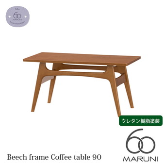 MARUNI60(マルニ60)のBeech frame coffee table90(ビーチフレームコーヒーテーブル90)は、サイズW900xD450xH449mmで、ロングライフをコンセプトとしたナガオカケンメイ氏によるロクマルビジョン(60VISION)に賛同したマルニ木工によるブランド・60(MARUNI60)シリーズの家具です。2020年はオークフレームチェアの原型である「No.79 セパレート型」の発売から60周年。この節目に60周年記念モデルとして、ビーチ材を採用したシリーズが登場。普遍的かつ長きに渡り愛用できるデザインなのでヴィンテージテイストのインテリアや北欧モダン、カジュアルモダンデイストのお部屋など、幅広いシーンで活用できます。
