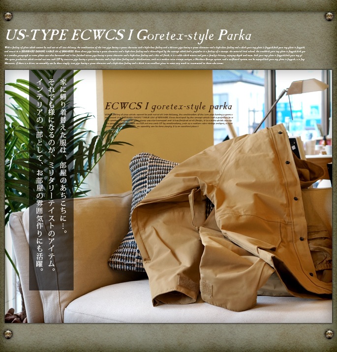ECWCSパーカーは1980年代後半に正式採用され、当時の新素材・ゴアテックスを使用しており、ゴアテックスパーカーと呼称されています。ECWCSとは(EXTENDED COLD WEATHER CLOTHING SYSTEM)の略で拡張式寒冷地被服システムの意味です。化繊のインナーウエアー・ライナーのセットでそれまでのM-65パーカーのような防寒性のみを追求したタイプから組み合わせにより様々な気候に対応できる画期的な被服システムになりました。主に1990年代から使用されている初期型(1ST GEN)や陸軍型と呼ばれるフードが露出したスラッシュポケットのタイプをショート丈にてリプロダクトしております。