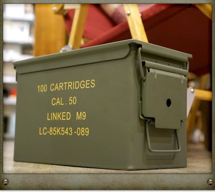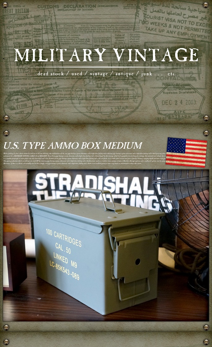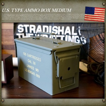 USタイプ アンモボックス(UStype AMMO BOX) ミディアムはアメリカ軍の弾薬ケースをモチーフにデザインされた収納ボックスです。印字や塗装の仕上げも含め、ミリタリーアイテムならではの質感を再現したフォルムはお部屋に絶妙なアクセントを加えます。ビンテージ感漂うアイテムなので収納雑貨としての実用的な使い方の他にオブジェとして飾って使用するのもおすすめです。