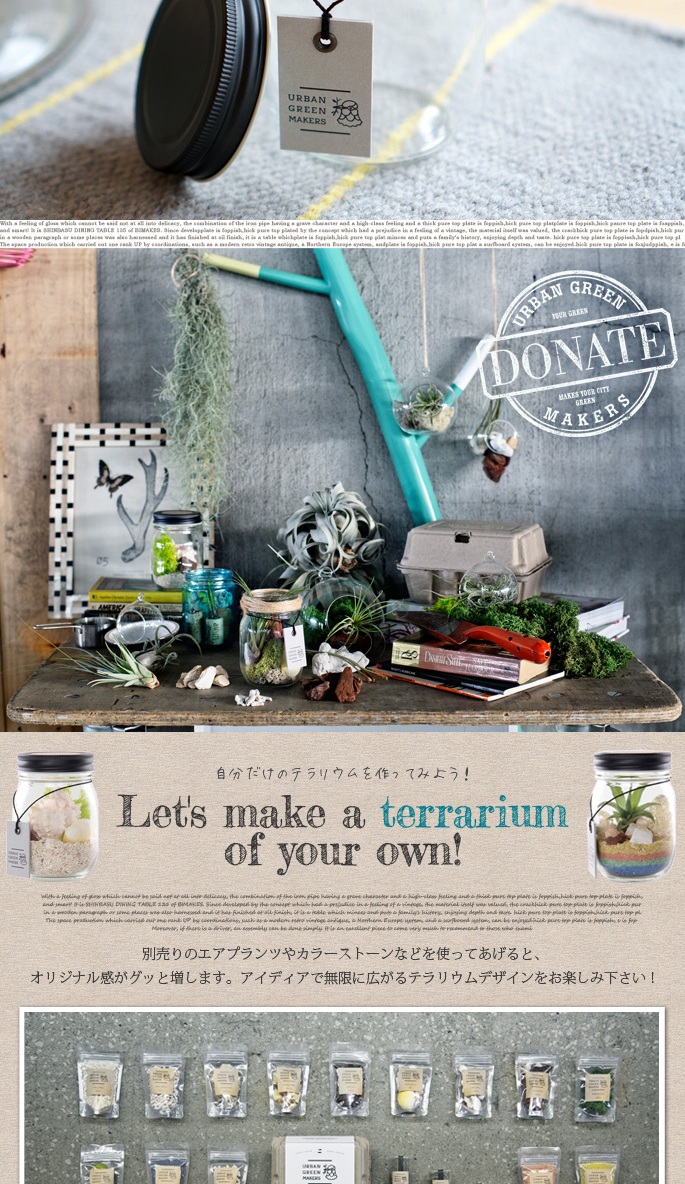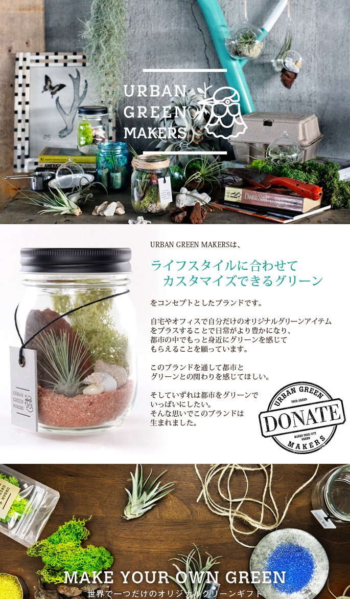 URBAN GREEN MAKERSは、「ライフスタイルに合わせてカスタマイズできるグリーン」をコンセプトとしたブランドです。自宅やオフィスで自分だけのオリジナルグリーンアイテムをプラスすることで日常がより豊かになり、都市の中でもっと身近にグリーンを感じてもらえることを願っています。このブランドを通して都市とグリーンとの関わりを感じてほしい。そしていずれは都市をグリーンでいっぱいにしたい。そんな思いでこのブランドは生まれました。自由にカスタムできるデザインは、手軽にグリーンと触れ合いながら、自分だけのオリジナルグリーンアイテムをお楽しみいただけます。
