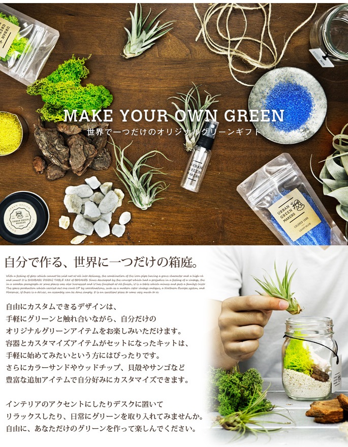 URBAN GREEN MAKERSは、「ライフスタイルに合わせてカスタマイズできるグリーン」をコンセプトとしたブランドです。自宅やオフィスで自分だけのオリジナルグリーンアイテムをプラスすることで日常がより豊かになり、都市の中でもっと身近にグリーンを感じてもらえることを願っています。このブランドを通して都市とグリーンとの関わりを感じてほしい。そしていずれは都市をグリーンでいっぱいにしたい。そんな思いでこのブランドは生まれました。自由にカスタムできるデザインは、手軽にグリーンと触れ合いながら、自分だけのオリジナルグリーンアイテムをお楽しみいただけます。