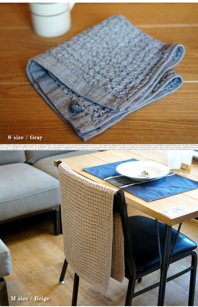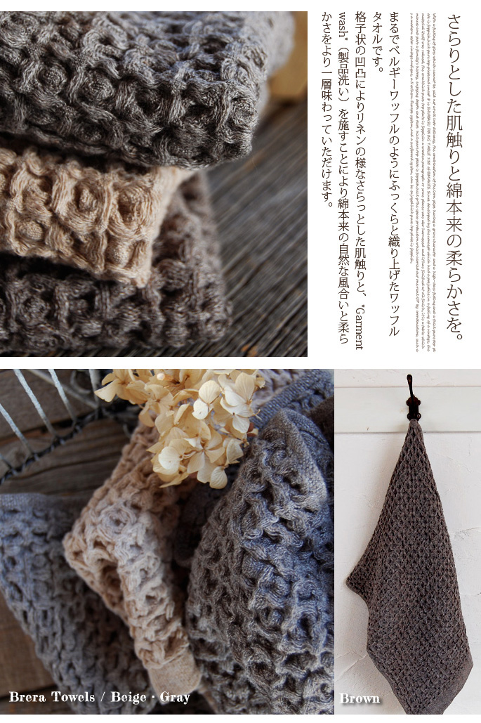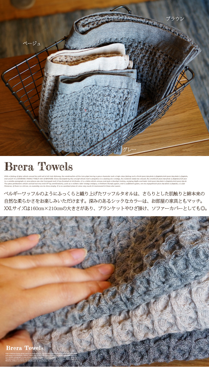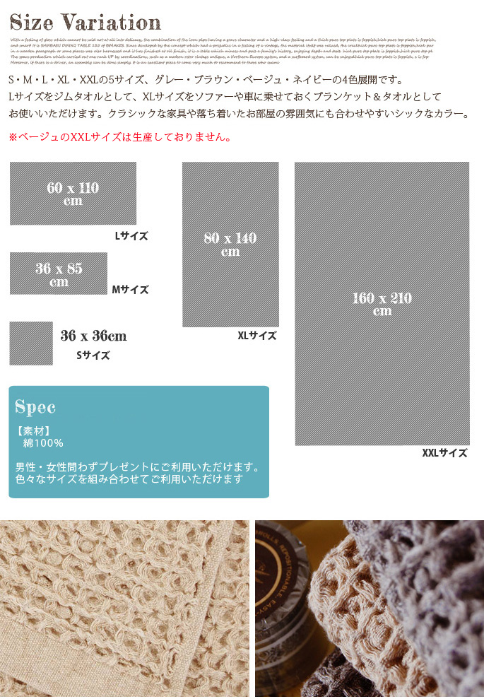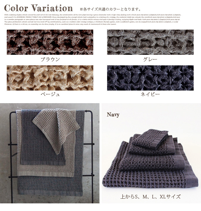 ベルギーワッフルのようにふっくらと織り上げたワッフルタオルは、さらりとした肌触りと綿本来の自然な柔らかさをお楽しみいただけます。コンテックスオリジナルの糸を使用して製品洗いを施すことで表現された深みのあるシックなカラーは、お部屋の家具と合わせても格好いいシリーズです。S・M・L・XL・XXLの5サイズ、グレー・ブラウン・ベージュ・ネイビーの4色展開です。Lサイズをジムタオルとして、XLサイズをソファーや車に乗せておくブランケット&タオルとしてお使いいただけます。