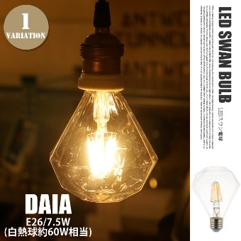 SWAN BULBのLEDは、フィラメント型LED電球の中で最も明るく(※白熱電球60W相当)、店舗やご家庭での実用性に優れ「フィラメント型電球は暗い」という概念を覆す明るさです。LEDならではの長寿命でランニング・コストメリットが非常に高いのも魅力で、電球色もタングステン過ぎず、適度な白色を保っています。球体のフォルムが可愛いBallは、違和感なく受け入れられる一般的なフォルムで、洋ナシ型のEdisonは、白熱電球黎明期の伝統的でもっともレトロで工業的にも愛すべきフォルムです。試験管型のBeaconは実験と研究の歴史を感じさせ、Daiaは18世紀のランプ街灯のような光の筋が感じられる等、各々が特徴的な光を演出します。