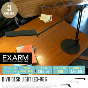 EXARMのDIVAシリーズはシェードに手をかざすだけでスイッチのON/OFFができるスマートライトシリーズです。タッチレススイッチライトはスマートフォンに使われているモーションセンサーを内蔵することで、手を触れずにスイッチをオンオフできます。調光、調色を25通りでチョイスできるので、ご使用環境やお好みに合わせてカラーバランスを調整することができます。消費電力はわずか6.4Wの省エネでありながら、明るさは60W相当のJIS規格のA形相当の十分な明るさがあります。サイズは幅1100×奥行き210×高さ1100mmで、重量 は約3.5 kgと使いやすい仕様です。