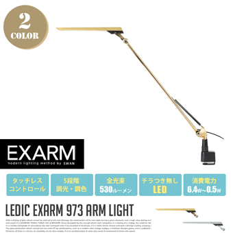 EXARMのLEX-973/LEX-974シリーズはシェードに手をかざすだけでスイッチのON/OFFができるスマートライトシリーズです。タッチレススイッチライトはスマートフォンに使われているモーションセンサーを内蔵することで、手を触れずにスイッチをオンオフできます。調光、調色を25通りでチョイスできるので、ご使用環境やお好みに合わせてカラーバランスを調整することができます。消費電力はわずか6.4Wの省エネでありながら、明るさは60W相当のJIS規格のA形相当の十分な明るさがあります。サイズは幅725×奥行き60×高さ725mmで、重量 は約0.5 kgと使いやすい仕様です。
