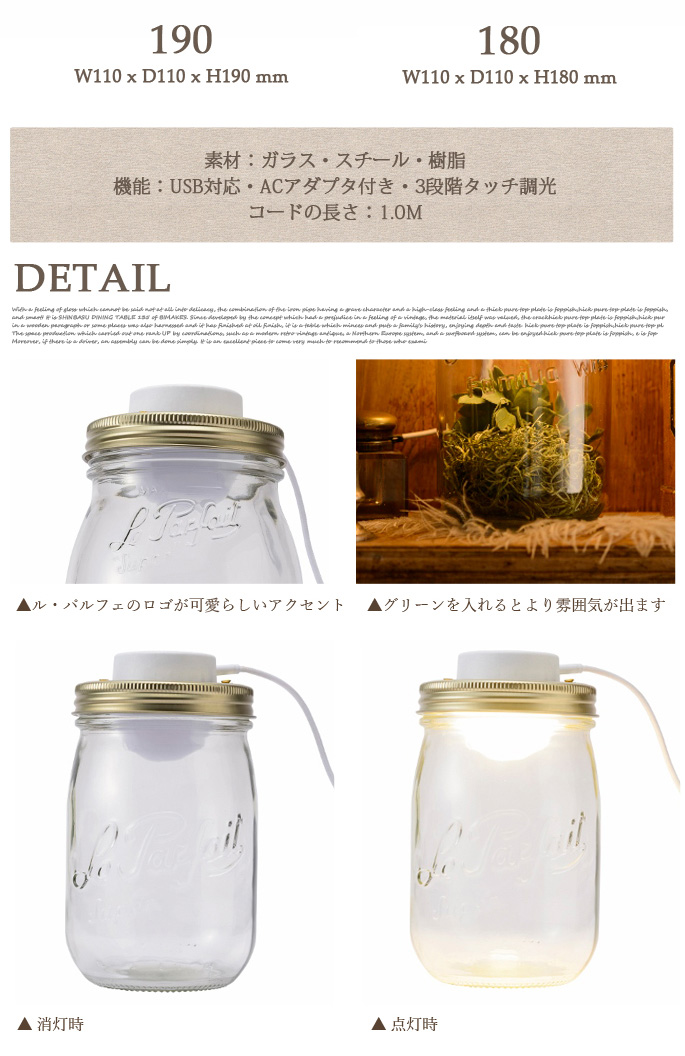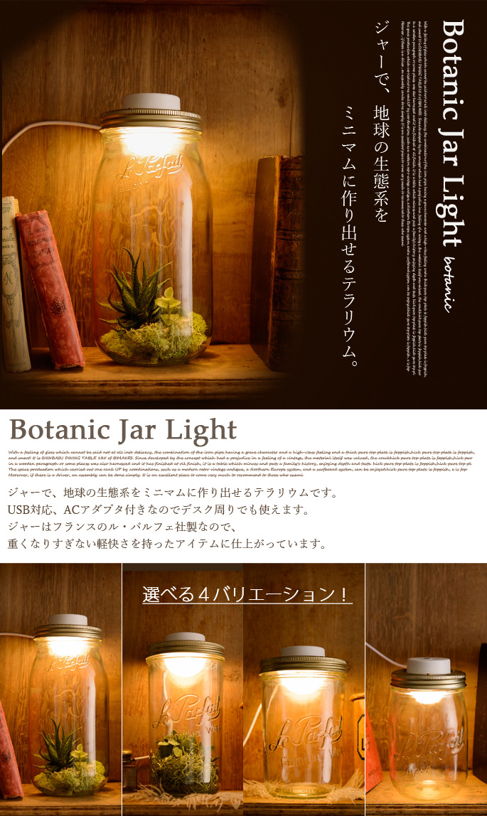 フランスのル・パルフェジャーを使用した軽快なイメージのLEDテラリウム。地球の生態系をミニマムに作り出せるテラリウムです。USB対応、ACアダプタ付きなのでデスク周りでも使えます。3段階タッチ調光・コード長1Mの間接照明です。