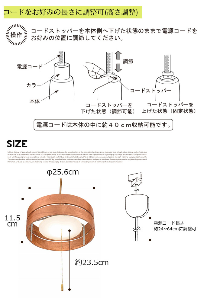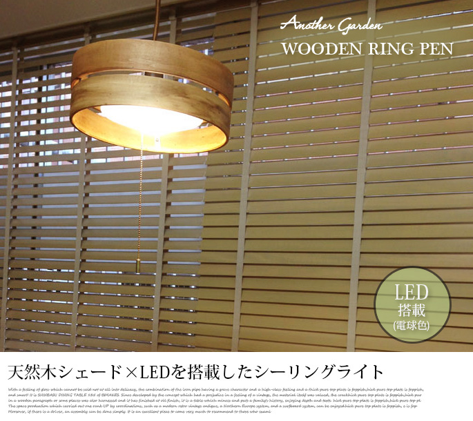 WOODEN RING PEN(ウッデンリングペン)は、家具と調和しやすい天然木を使用したLED1灯ヘ゜ンタ゛ントライトです。幅256mm、奥行き256mm、高さ115mmとコンパクトなサイズで、個室て゛の使用にちょうと゛良いサイ ス゛て゛す。シンプルで定番のデザインながら、削り出しした天然木の風合いが職人技光っており、天然木ならではの存在感を醸し出しています。アンティークナチュラル、アンティークブラウンの2色からお選びいただけて、ヴィンテージ、レトロ、北欧、、カフェ風、ナチュラルテイストなど幅広いお部屋に合わせてお使いいただけます。