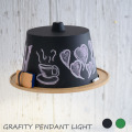 GRAFITY PENDANT LIGHT(グラフィティ ペンダントライト)APE-008は、付属のチョークと黒板消しによって、自在な変化を生み出すことのできるペンダントライトです。普段は頭上にあってなかなか注目されれることの少ない照明に光を当てた商品で、ハットのようなコミカルなフォルムも、そのポジティブさにひと味添えています。照明自体をLED化したことで、発熱による火傷の懸念が無くなったため、点灯中にお子様が触れても安全です。また、塗装は通常の焼付け塗装と違い、高温でも変色せず電気絶縁性のある「アルキド樹脂塗装」を施し、時間と手間をかけて仕上げたこだわりのプロダクトです。