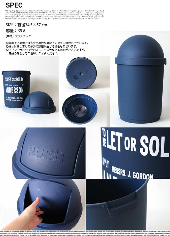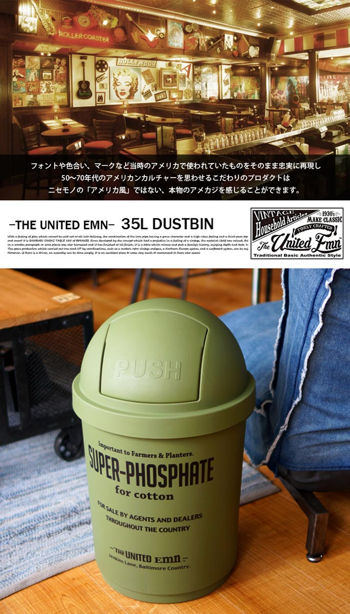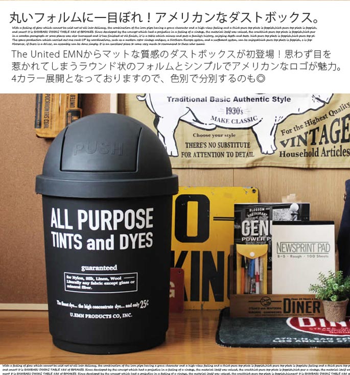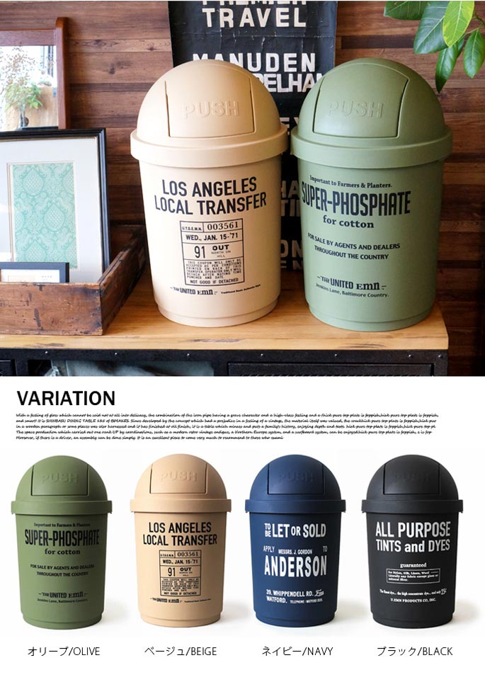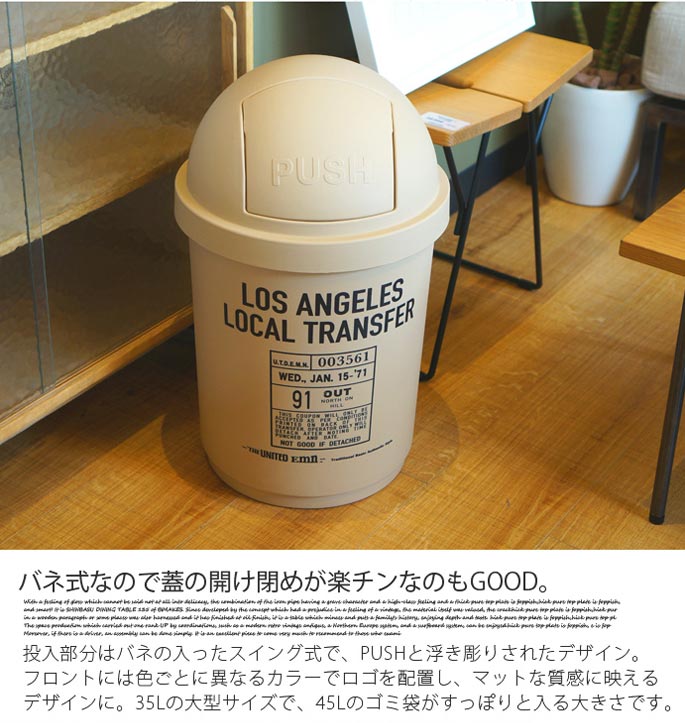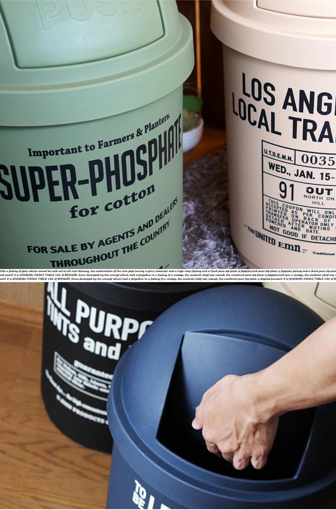 思わず目を惹かれてしまうラウンド状のフォルムと、シンプルでアメリカンなロゴが魅力的。投入部分はバネの入ったスイング式で、PUSHと浮き彫りされたデザイン。フロントには色ごとに異なるカラーでロゴを配置し、マットな質感に映えるデザインに。35リットルの大型サイズで、45Lのゴミ袋がすっぽりと入る大きさです。バネ式なので蓋の開け閉めが楽チンなのもGOODですね。4カラー展開となっておりますので、色別で分別するのも◎屋内にも・屋外にも使えるゴミ箱。ゴミ箱としてだけでなく、収納BOXとして使うのも◎シンプルなデザインなので、メンズライク・アメリカン・ナチュラルなどなど…お部屋のテイスト問わずハマるデザインです!