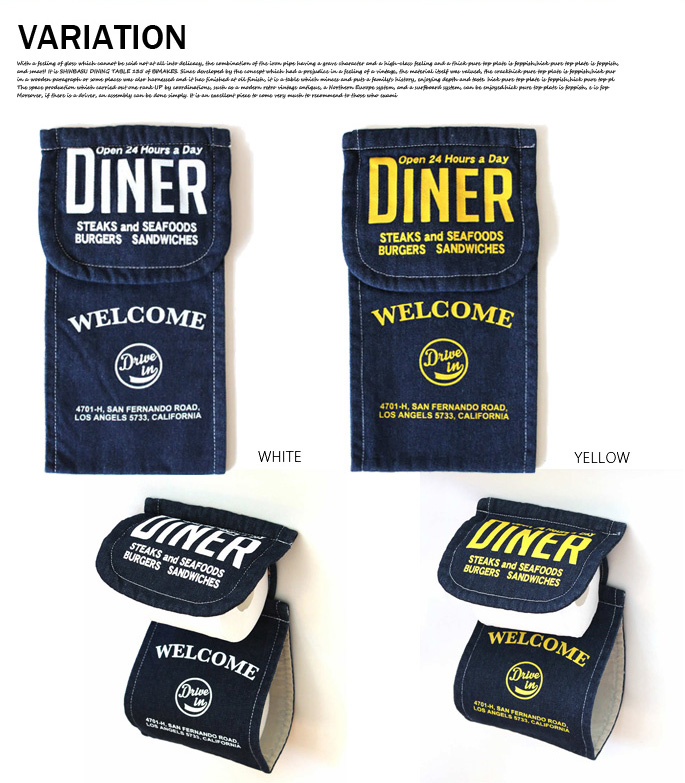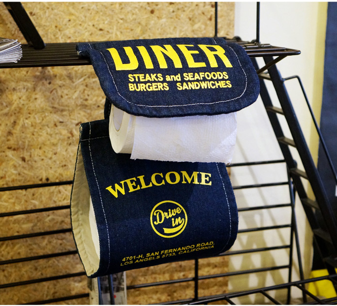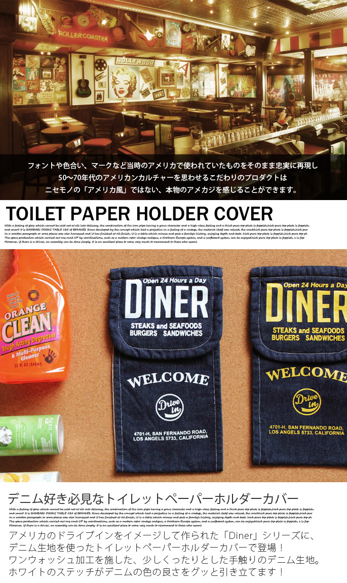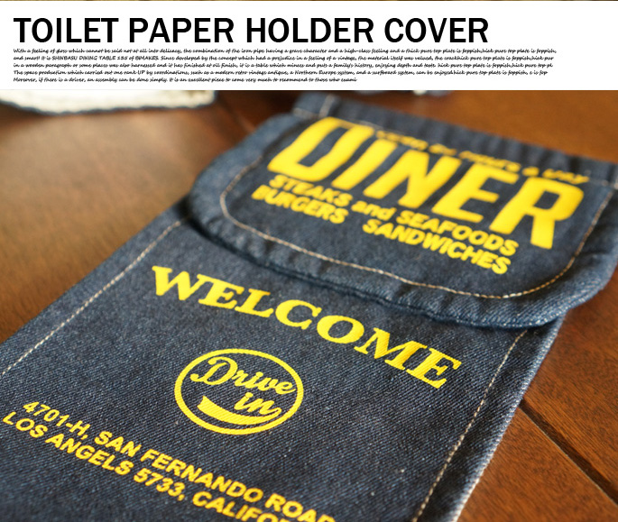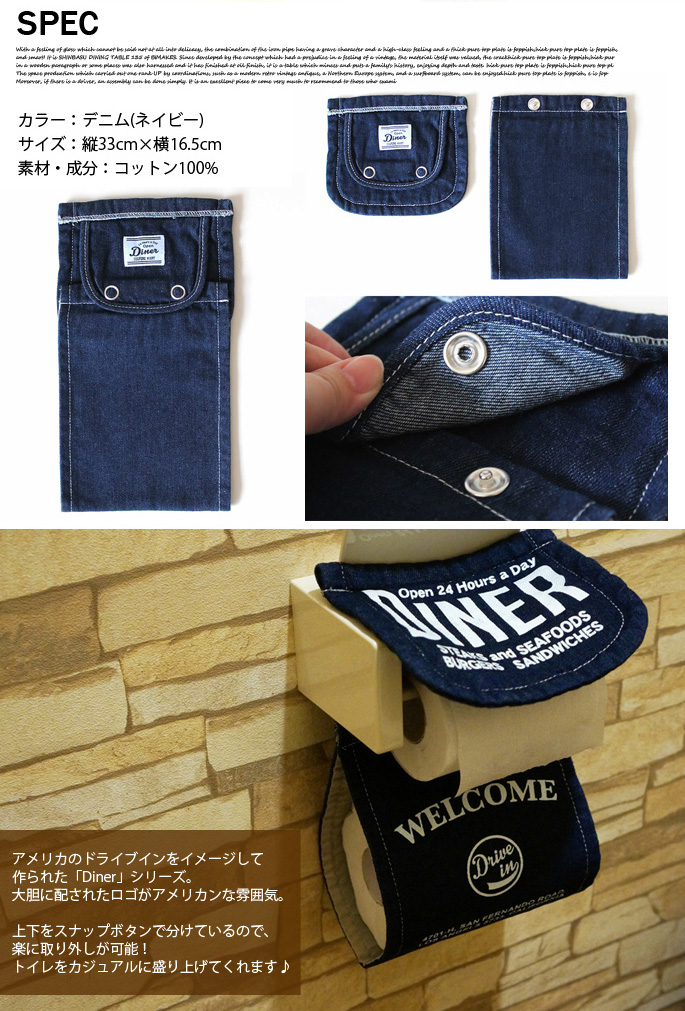 アメリカのドライブインをイメージして作られた「Diner」シリーズ。今回は、デニム生地を使ったトイレットペーパーホルダーカバーとなって登場です!ワンウォッシュ加工を施した、少しくったりとした手触りのデニム生地に、ホワイトのステッチがデニムの色の良さをグッと引き立てます!上下をスナップボタンで分けているので、楽に取り外しが可能!トイレをカジュアルに盛り上げてくれる一点です♪
