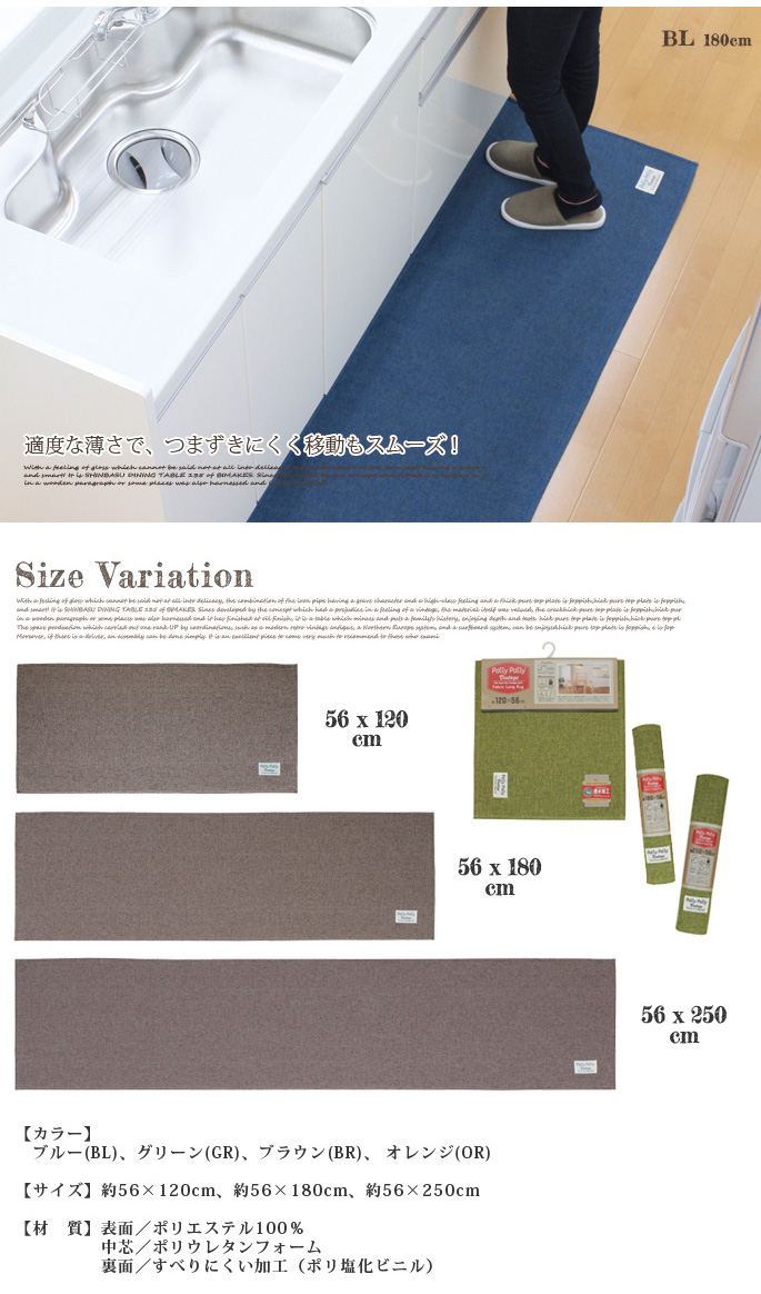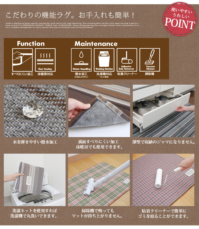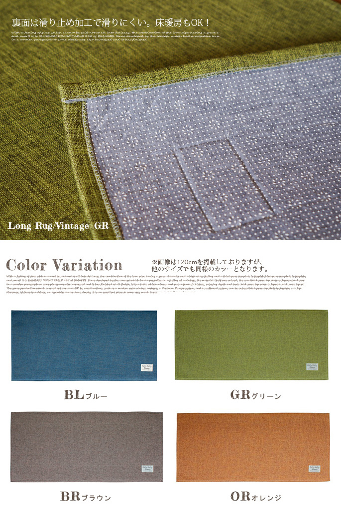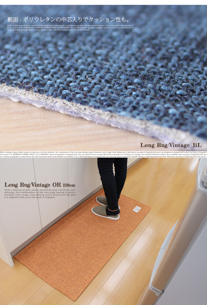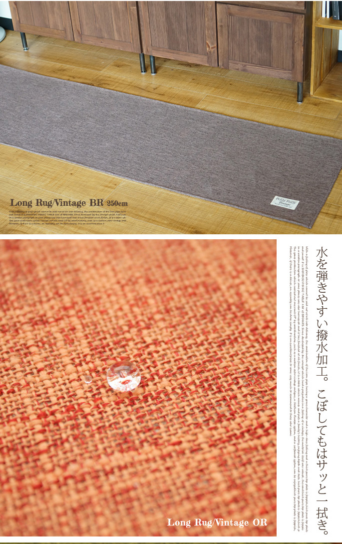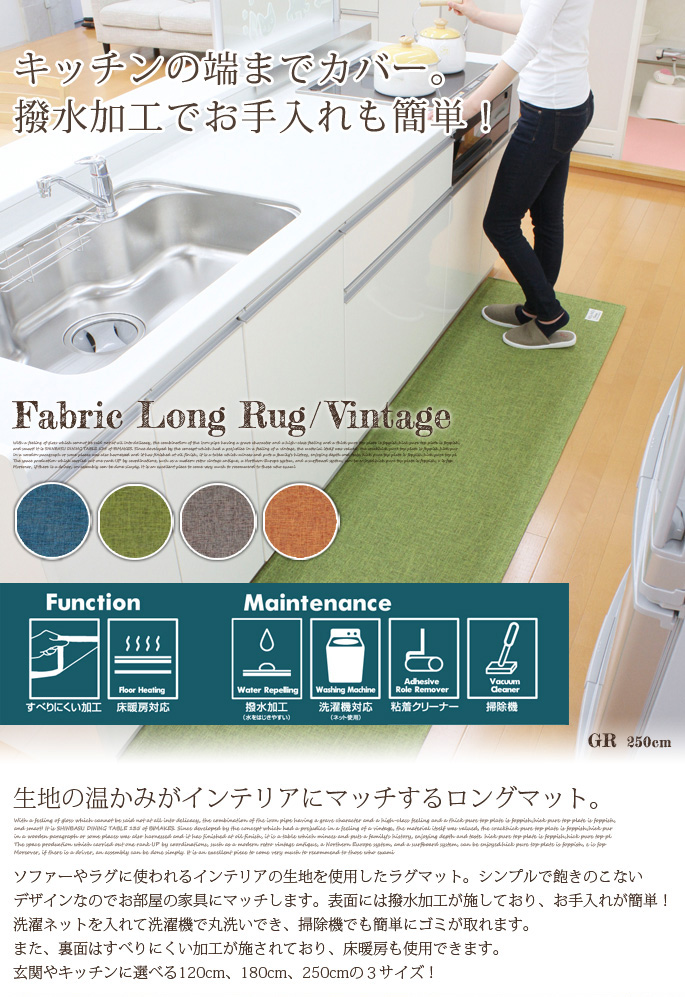 ヴィンテージファブリックロングラグ(Fabric Long Rug)は落ち着いた雰囲気のカラーリングがキッチンをシックに演出するキッチンマットです。すべりにくい加工や床暖房対応、撥水加工や洗濯機対応など、デザインのみならず機能性に優れたラグマットなのでリビングや寝室など様々なシーンで活用できます。カラーは全4色の中からお選びいただけます。掃除機や粘着クリーナも使いやすい仕様になっているのでお手入れも楽々です。