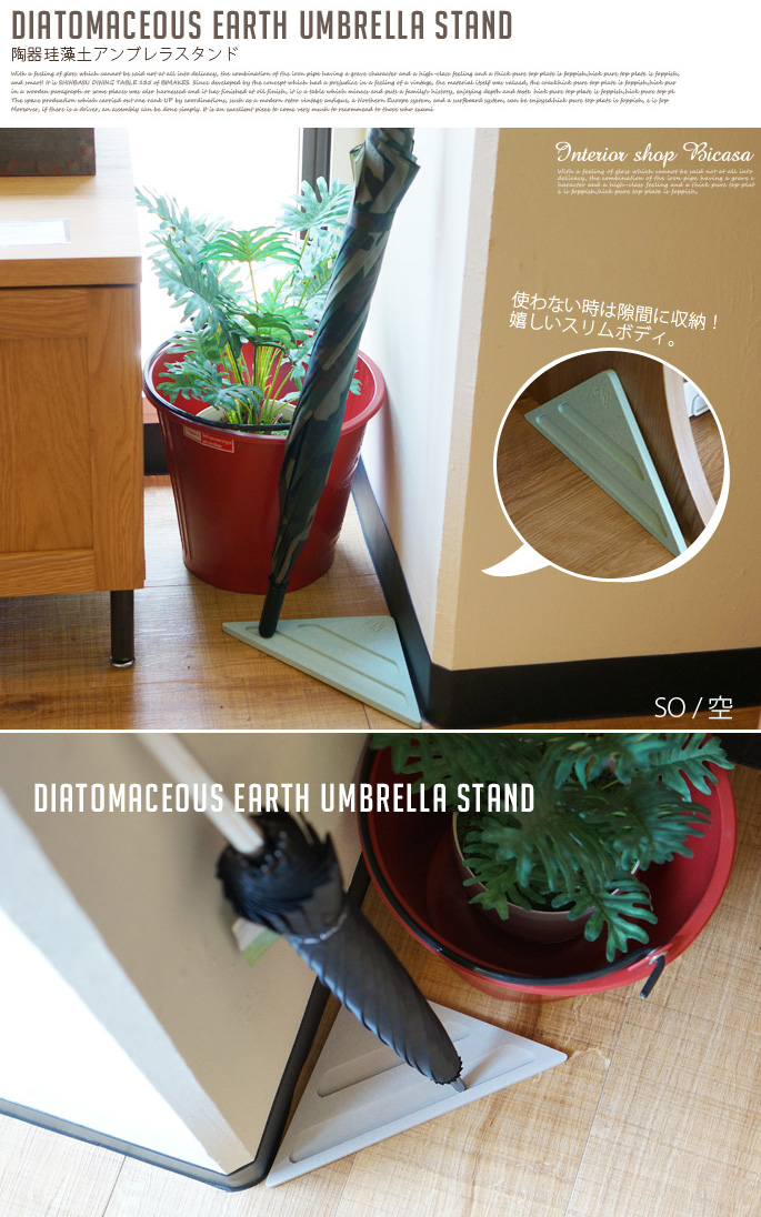 珪藻土アンブレラスタンドは、吸水性に優れた珪藻土でつくられたアンブレラスタンドです。立てた傘から流れ落ちる水分をすばやく吸い取ってくれるのでいつも玄関はカラリとスッキリ♪コンパクトサイズなので必要な時だけ出せる邪魔にならない傘立てです。シンプルなデザインなので珪藻土のメリットを活かして鉢受けや洗面コーナーなどでもお使いいただけます。KU(雲)・SA(桜)・SO(空)の3バリエーション。ギフトにもオススメアイテムです。