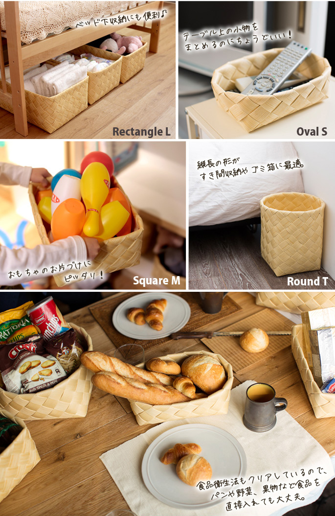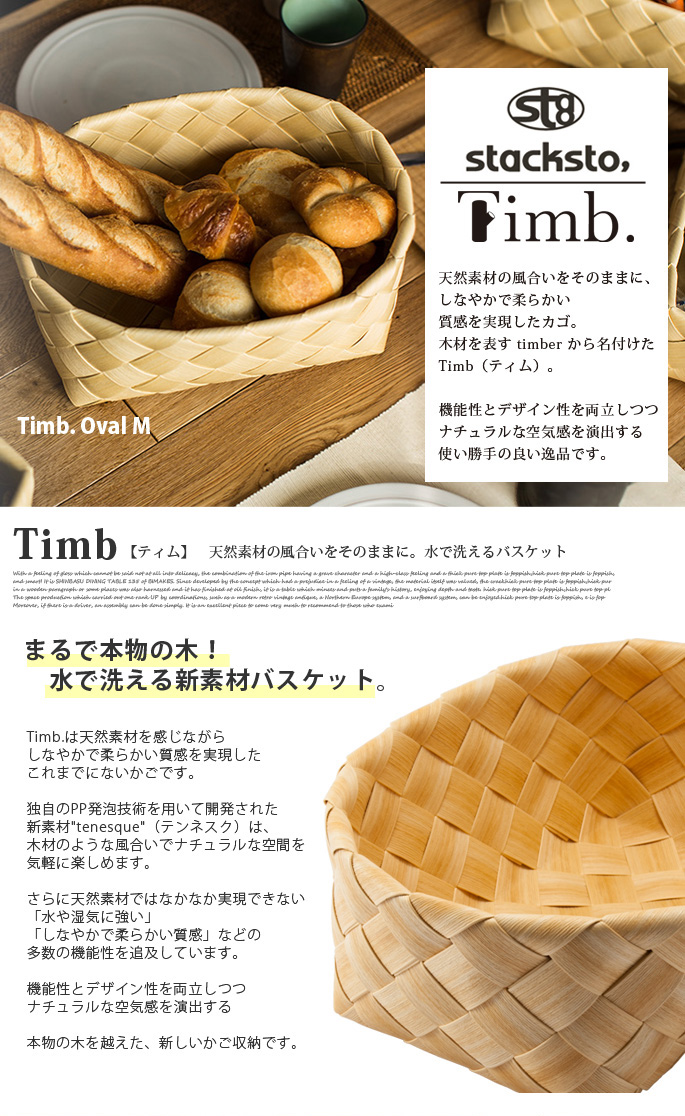 天然素材の風合いをそのままに、しなやかで柔らかい質感を実現した、全く新しい“水で洗える”バスケットTimb.(ティム)。合成樹脂を独自の技術で仕上げた素材を使い、職人がひとつひとつ丁寧に編み上げたTimbは、木材のような風合いでナチュラルな空間を気軽に楽しめます。 さらに天然素材ではなかなか実現できない「水や湿気に強い」「しなやかで柔らかい質感」などの多数の機能性を追及しています。ラウンドTは底が深くて長いもの収納に最適。細長い形を生かして隙間収納や、さらにゴミ箱としても活躍します。機能性とデザイン性を両立しつつナチュラルな空気感を演出する本物の木を越えた、新しいかご収納です。