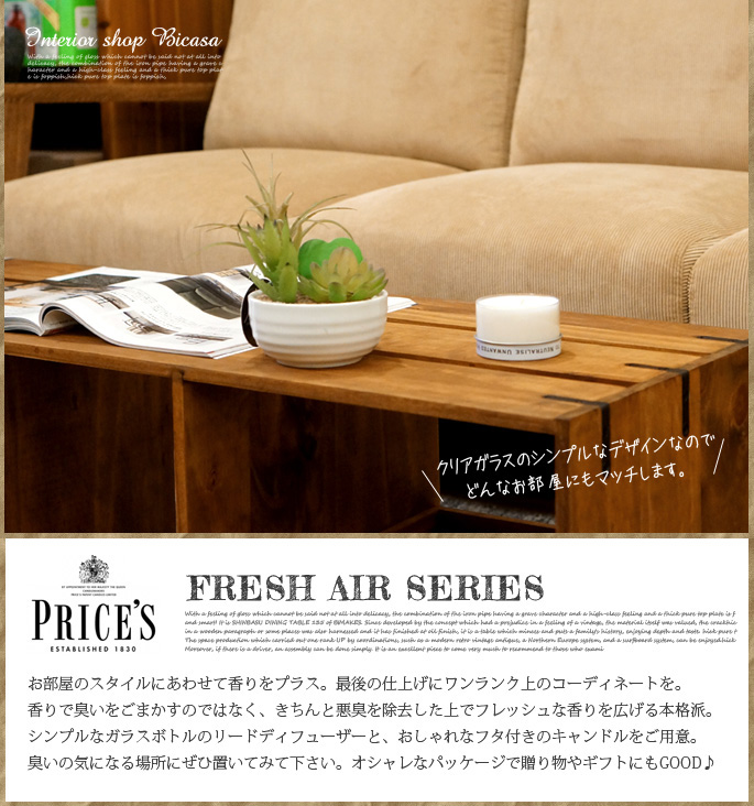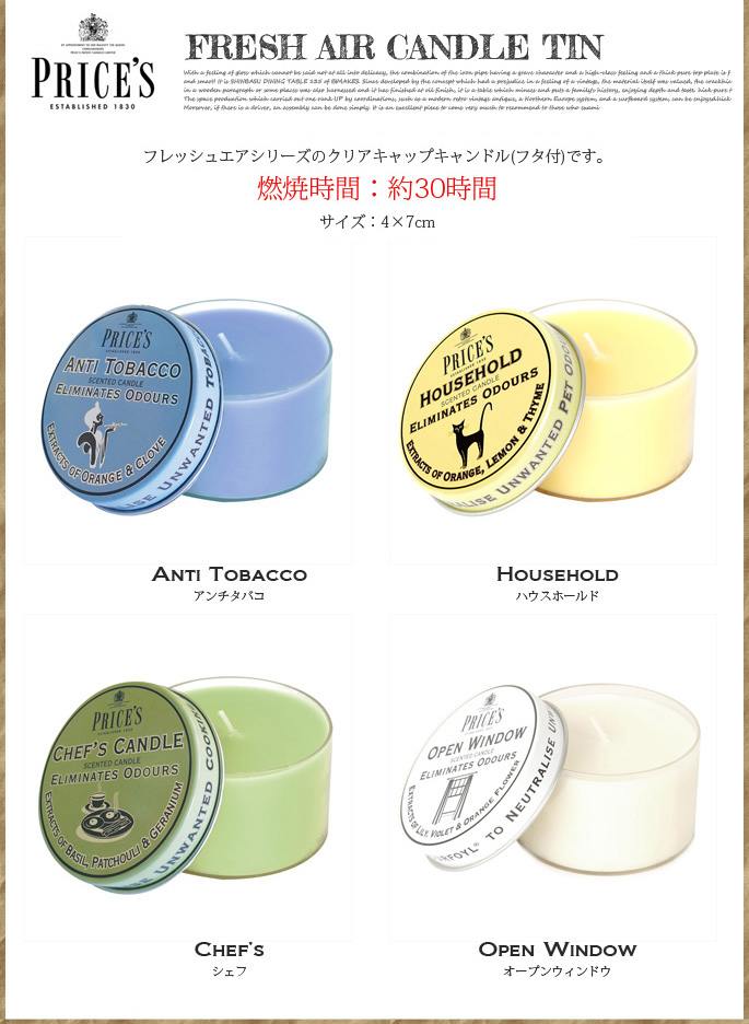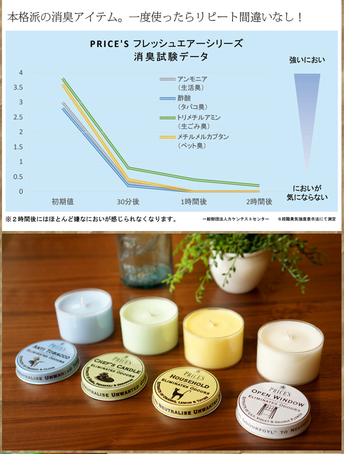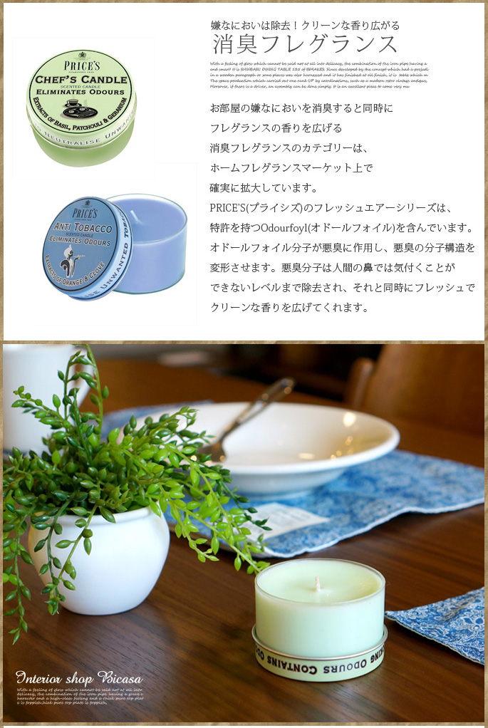 嫌なにおいは除去!クリーンな香り広がる消臭フレグランス。英国王室御用達の由緒あるキャンドルのトップメーカーPRICE’S(プライシズ)のフレッシュエアーシリーズのCANDLE TIN。お部屋の嫌なにおいを消臭すると同時にフレグランスの香りを広げる消臭フレグランスのカテゴリーは、ホームフレグランスマーケット上で確実に拡大しています。PRICE’S(プライシズ)のフレッシュエアーシリーズは、特許を持つOdourfoyl(オドールフォイル)を含んでいます。オドールフォイル分子が悪臭に作用し、悪臭の分子構造を変形させます。悪臭分子は人間の鼻では気付くことができないレベルまで除去され、それと同時にフレッシュでクリーンな香りを広げてくれます。オシャレなパッケージでギフトにもオススメ!