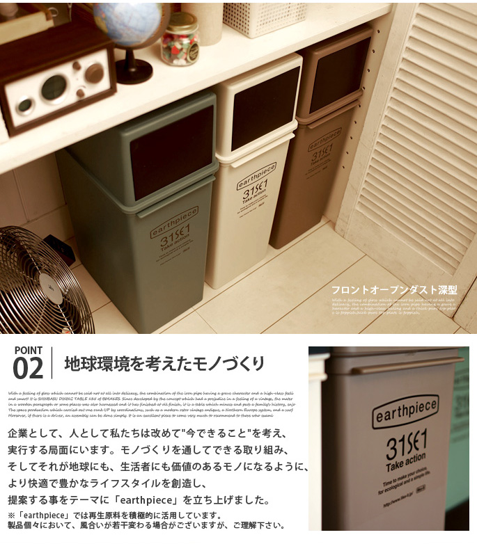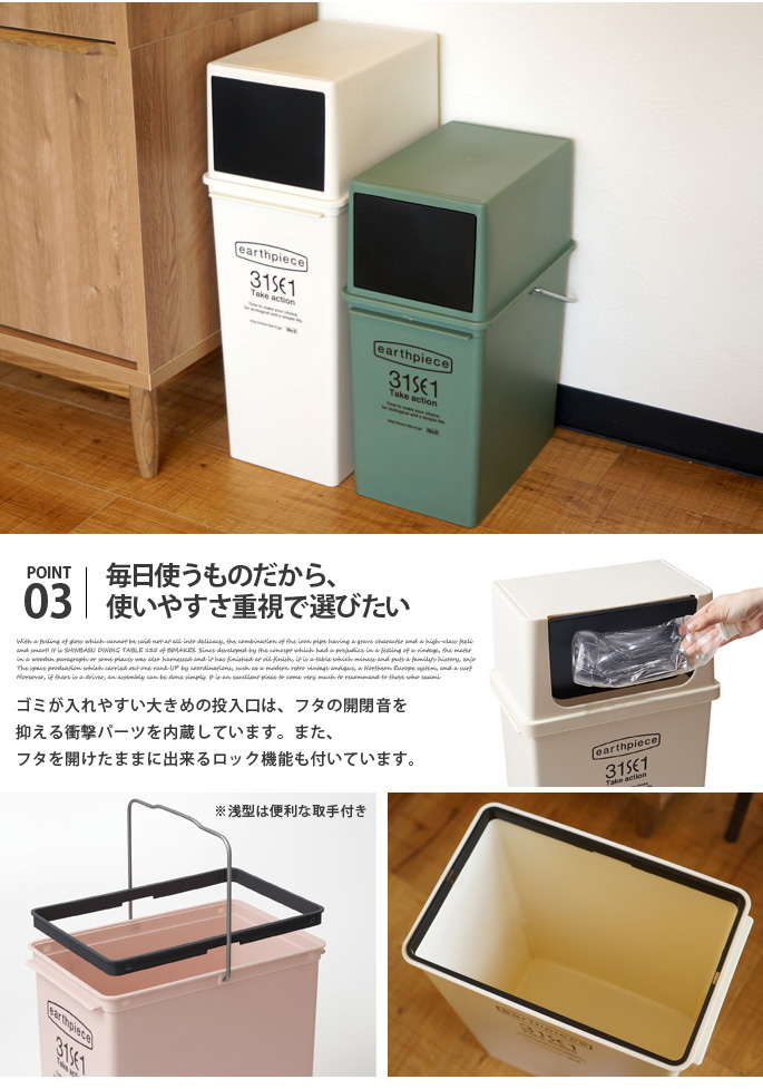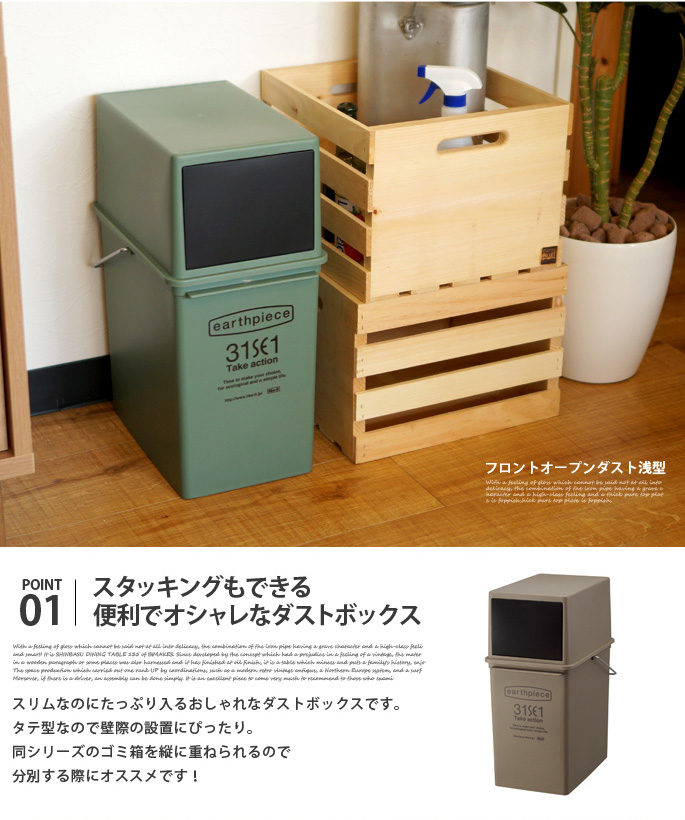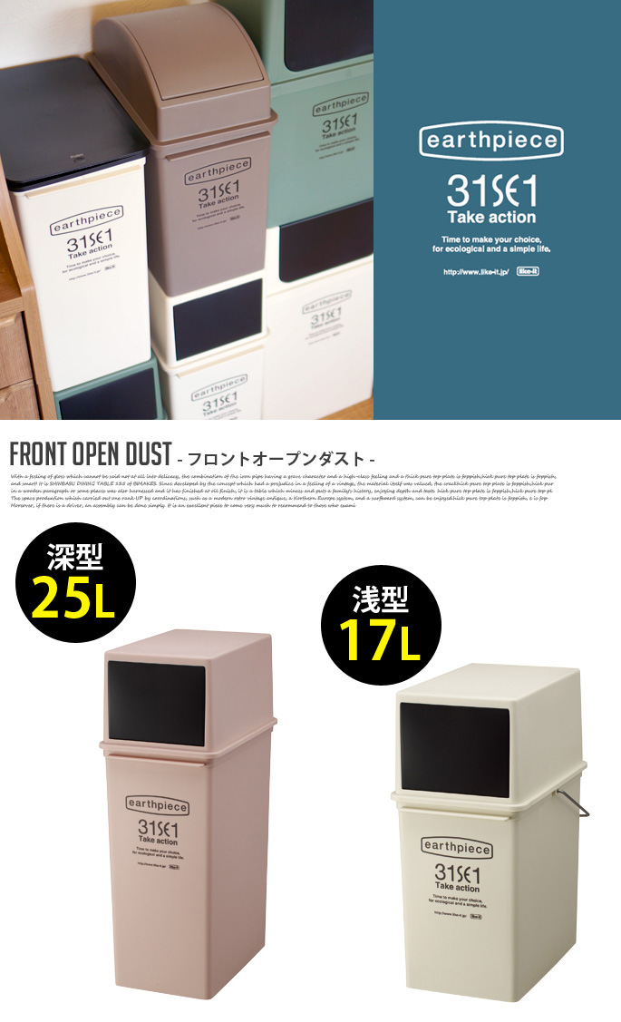積み重ねに対応するフロントオープンダスト(深型/25リットル)。投入口は大きめの設計で使いやすい上、フタの開閉音を抑える緩衝パーツを内蔵するなど、細かな配慮を行っています。●同機種及び、他モデルと積み重ねて使用できます。●本体内側には、ゴミ袋を装着しやすいバックストッパー付。●投入口を開放したままにできるロック機能付。like-itはお客様にできるだけ永く商品を使い続けていただきたい、商品を愛していただきたいと願ってものづくりをしています。省資源・環境配慮製品の提供に取り組み、地球にやさしい商品の開発に努めています。
