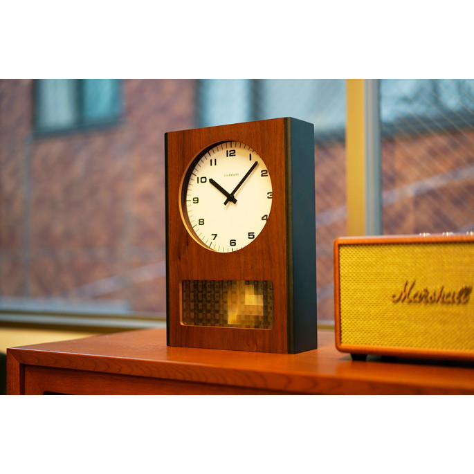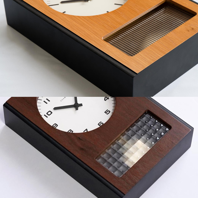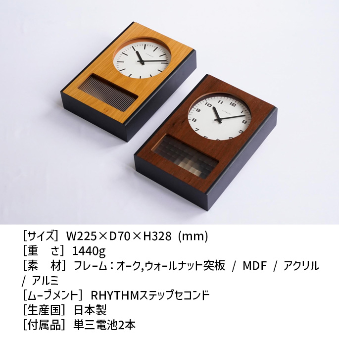 | | 〈WALNUT〉のアクリル部分の格子模様はどこまでも続く太平洋の広がりを表し、〈OAK〉の縦ストライプのアクリルは穏やかに立ち続けるさざ波を表しています。ふたつの海の中で揺れる振り子が、私たちの穏やかで平和な時間を共に刻む、ネオビンテージな雰囲気をもった振り子時計です。静音のムーブメントを使用しておりますので、カチコチ音もなく、寝室などでも安心してご使用いただけます。 |