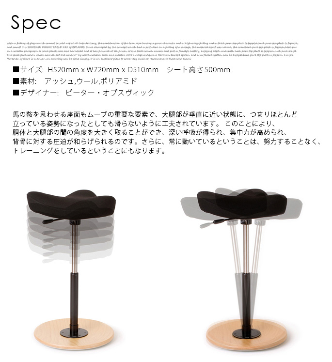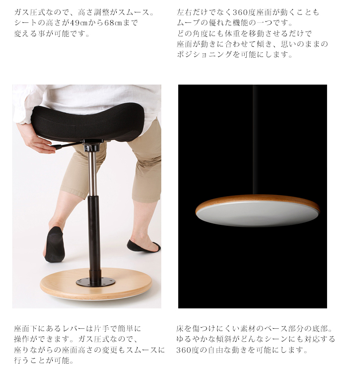 身体をシートに預けた瞬間から、究極に自由な座り心地を得るでしょう。キッチンでメールするときも、忙しい朝食時に電話をしながら複数の用件をこなすときも、ムーブは行動を共にし、あなたをサポートします。360 度の回転が可能という「ムーブ」は、思いのままのポジションをもたらします。座るための道具、立ったときの姿勢をサポートする道具という2 つの側面を持つムーブの特徴として、緩やかな傾斜を持つベースがありますが、ベースに内蔵されたチルト機構により、身体がどの方向へ動いても追随するように工夫されています。
