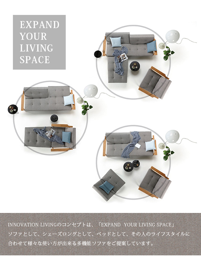 INNOVATION LIVING(イノベーションリビング)のUnfurl(アンファール)はサイズW2000xD940-1200xH840(SH400)mmでMIXED DANCE BLUE /TWIST GRANITEからお選びいただける3人掛けソファベッドです。ベッドとして快適なクッション材を採用しているため、ゆったりとした座り心地・寝心地です。ライフスタイルに合わせて様々な使い方が出来る多機能ソファです。