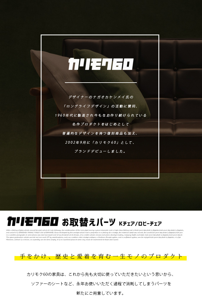 カリモク家具のDNAをうけつぐロングライフのブランド「カリモク60」のKチェア1シーター シートパーツです。サイズW530×D510×H145mm、このページではモケットグリーンがお選び頂けます。カリモク60の家具は、これから先も大切に使っていただきたいという思いから、ソファーのシートなど、永年お使いいただく過程で消耗してしまうパーツを新たにご用意しています。※Kチェアのパーツの購入ページです。※Kチェア本体は別売りとなります。