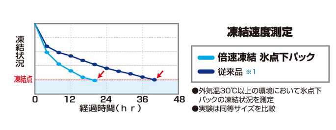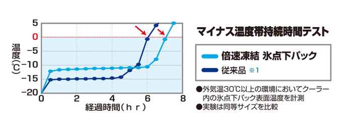 強力保冷剤「氷点下パックシリーズ」の倍速凍結タイプ。事前準備の凍結時間が約18~24時間(※2)と従来品の約半分になった。食べ物や飲み物を持って、ぜひ、アウトドアにお出かけください!オススメです。