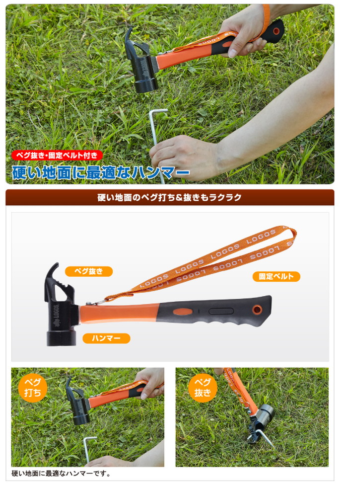 LOGOS(ロゴス)のLOGOS パワーペグハンマーはペグ抜き、固定ベルト付きの硬い地面にも最適なハンマーです。手にフィットする持ち手と、しっかりとした重みもあり、面倒なペグ打ちもスムーズに!ペグ抜きも付いているのでとても便利です。